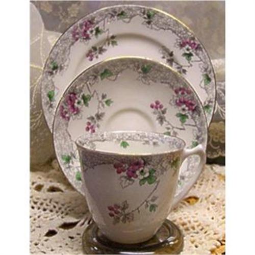 Delicate Shelley Floral Lace pattern trio consisting of teacup, saucer and tea plate in the Stand shape. One of Shelley's classic patterns, the motif is one of dainty florals on silvery painted lace.<p>All three pieces are in near excellent condition with only minor base rubbing. Green Shelley inkstamp and hand scripted pattern number '293', circa 1937.