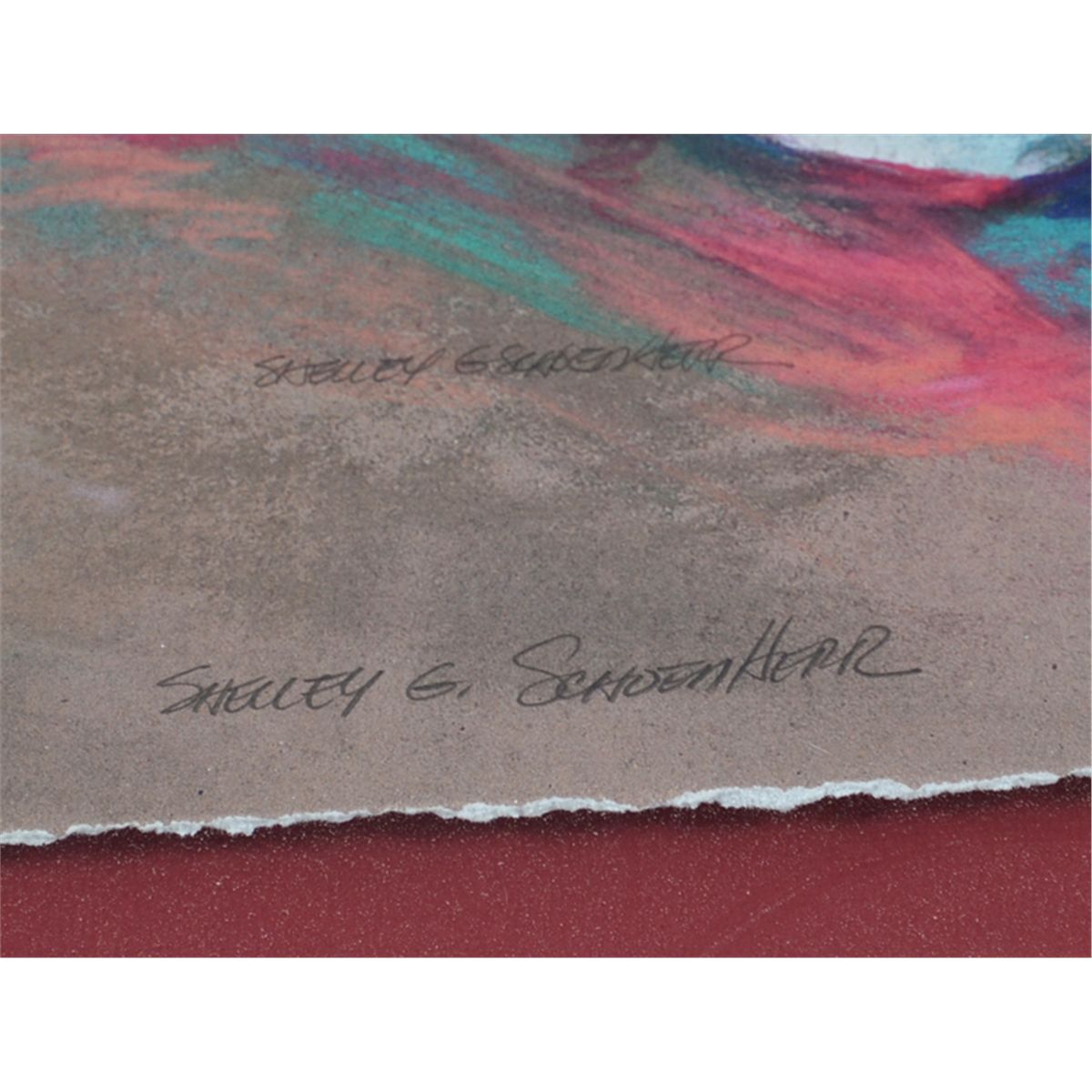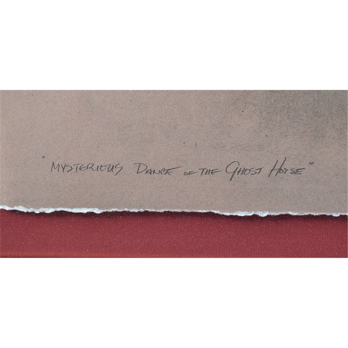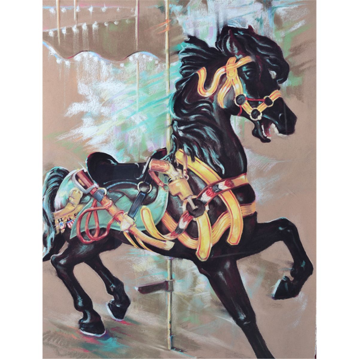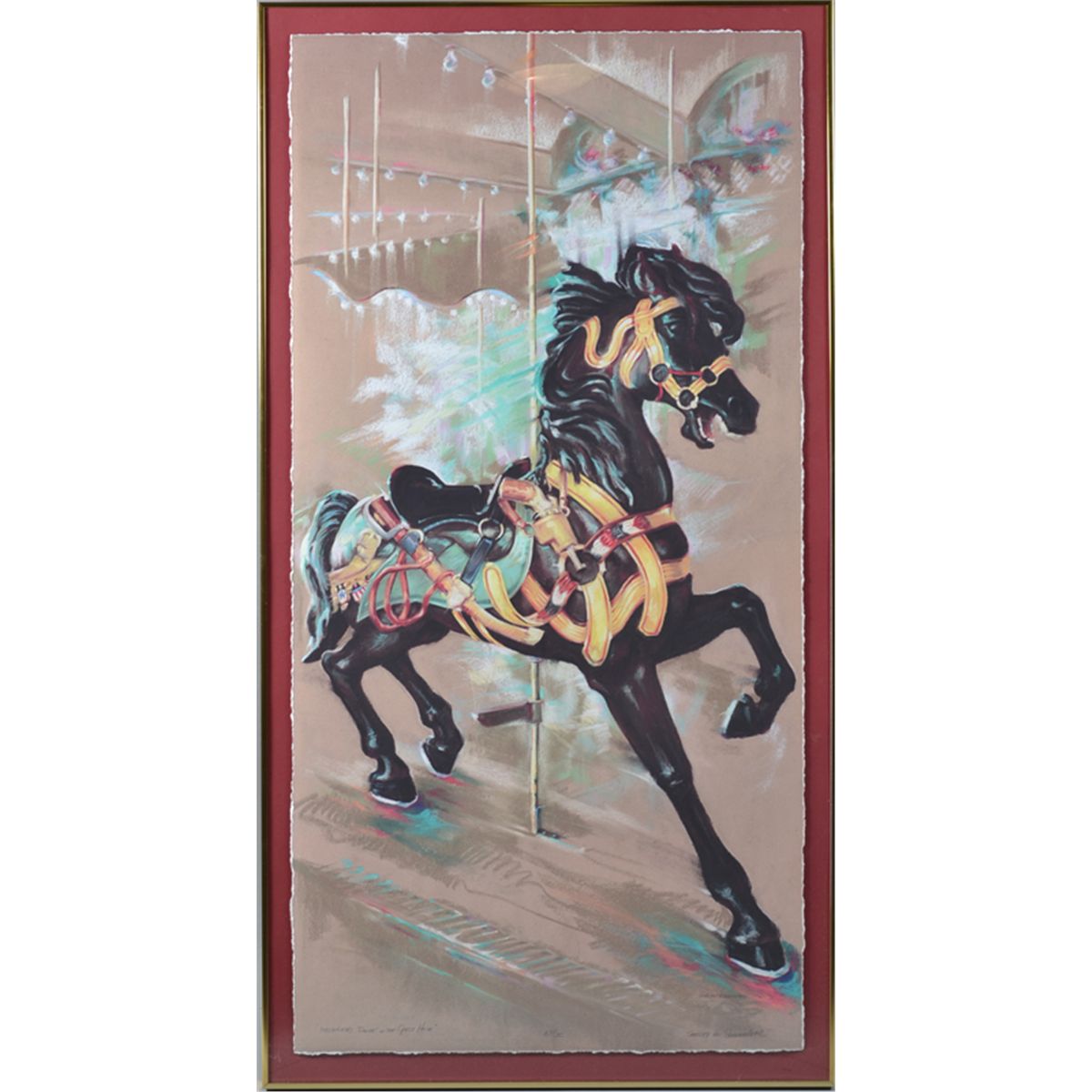 Titled "Mysterious Dance of the Ghost Horse." depicting a carousel horse with description by artist regarding having an emotional connection of the original carved carousel horses she's visited. With COA signed by the artist. 72" H x 36" W, not including frame. Framed in gold metal frame and behind Plexiglas. Circa 21st century. Private collection Mt. Christie's Estates, Oxford, MI.