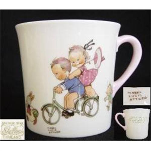 Shelley Mabel Lucie Attwell Small Childrens Mug Signed By The Artist c1920 A White Mug Decorated With Two Children On A Tricycle A Bunny And Pixes With A Verse On The Other Side Pink Handle And Rim