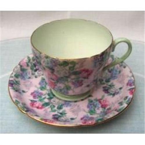 Color Rich Shelley Hydrangea Chintz Cup and Saucer This breathtaking Shelley Bone China teacup and saucer is in the Hydrangea Chintz pattern, registered in the Shelley pattern book in the year 1945.<p>Windsor/Richmond shape set is rated to be in near excellent condition. Overall green, lavender & purple Hydrangea motif on a rosey mauve field. Interior, handle and collared foot are a solid pastel leaf green. Trimmed and accented with brilliant gold detail.<p>Shelley Bone China Cartouche inkstamp, 1945 - 1966 with red script pattern number 13456/63 (teacup) 13456/53 (saucer) and color code 10.