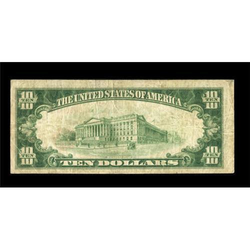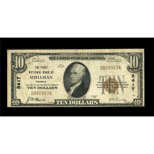 <B>Shellman, GA</B></I> - $10 1929 Ty. 1 <B>The First NB</B></I> Ch. # 8417<BR> This obscure Randolph County community had but one issuing bank and a scant three notes survive in large and the same number in small per the latest census figures. We first offered this piece in our 2005 FUN Signature Auction where it realized $2,070. The paper is solid for the grade with boldly printed design elements. <B>Fine.</B></I><BR><I>From The Amelia Island Collection.</B></I><BR><BR><b>Shipping:</b> Coins & Currency (<a target="_blank" href="http://www.heritageauctions.com/common/shipping.php">view shipping information</a>)