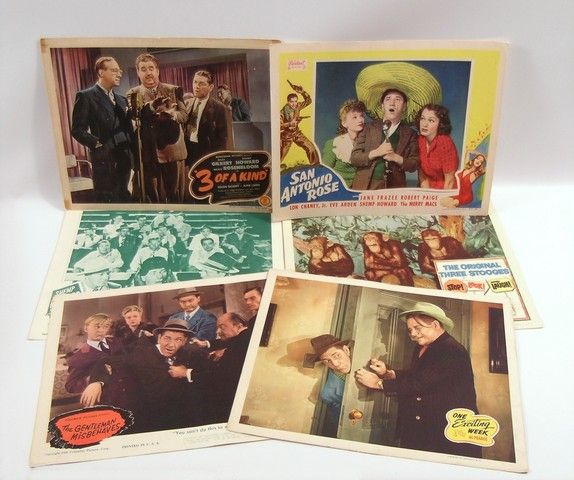 Shemp Howard Lobby Card Collection Shemp Howard, the oldest of the Howard brothers, of "Three Stooges" fame was the only Stooge to have his own successful career as an actor in other films not connect with the comedy trio. He had already made a name for himself with such stars as W. C. Fields before he joined the Stooges, and then left the Stooges when youngest brother Curly Howard took over to pursue his own interests, but did come back for several years after Curly's death. These are amazingly rare and beautifully preserved original lobby cards from some of Shemp's best solo efforts. It includes the murder-mystery musical "San Antonio Rose" (1941) with Eve Arden and Lon Chaney, Jr.; "The Gentleman Misbehaves" (1945); "One Exciting Week" (1946); "3 Of A Kind" (1944), in which Shemp played himself, and used some of his actual autobiographical adventures in the film, and the popular short "Mr. Noisy" (1946) in which Shemp starred in the title role. As a bonus the collection also includes the original color lobby card for "Stop Look and Laugh" (1960), starring ventriloquist Paul Winchell, and the famous Marquis Chimps (who are featured on the card). The movie had Winchell telling stores, with flashbacks of the original Stooges (Larry, Moe and Curly Joe Howard), from their short "Higher Than A Kite" (1943). A one-of-a-kind collection for Stooges, and especially Shemp Howard fans. (All Lobby Cards are 14"x11").