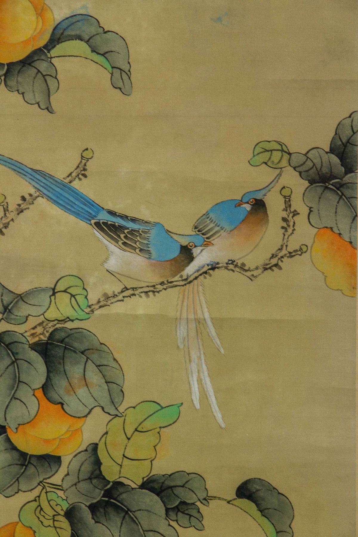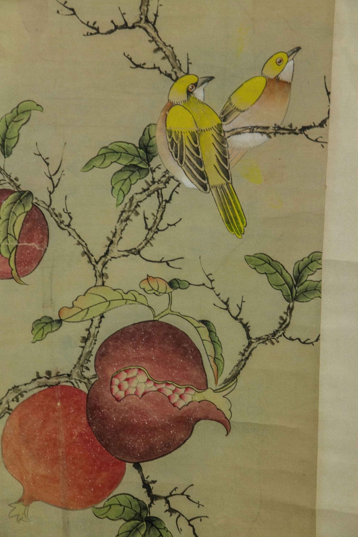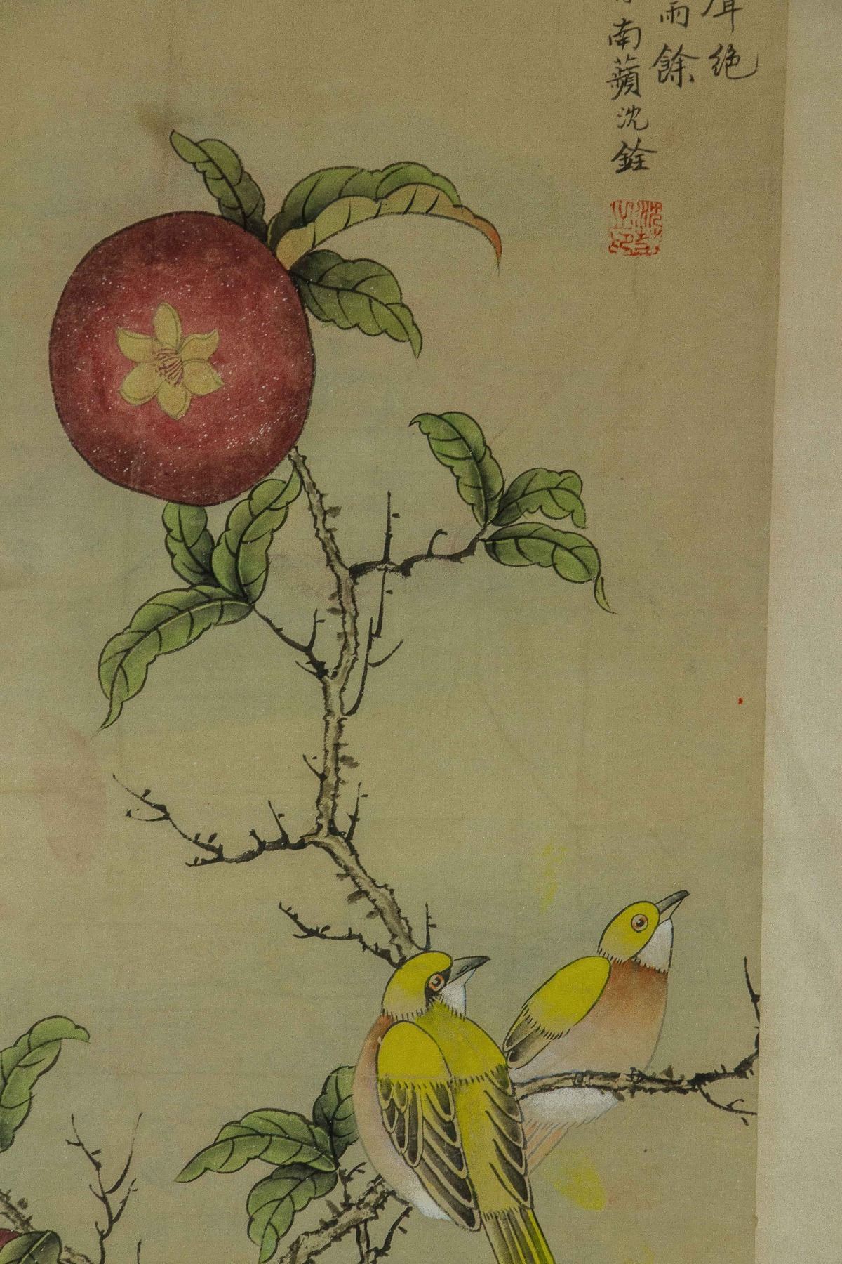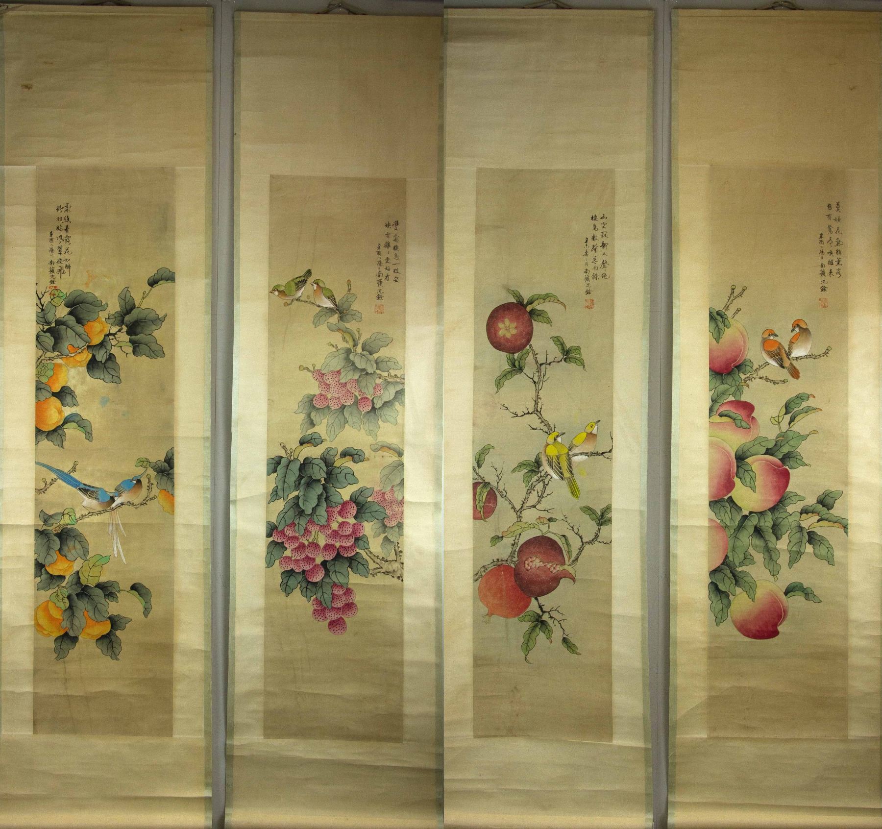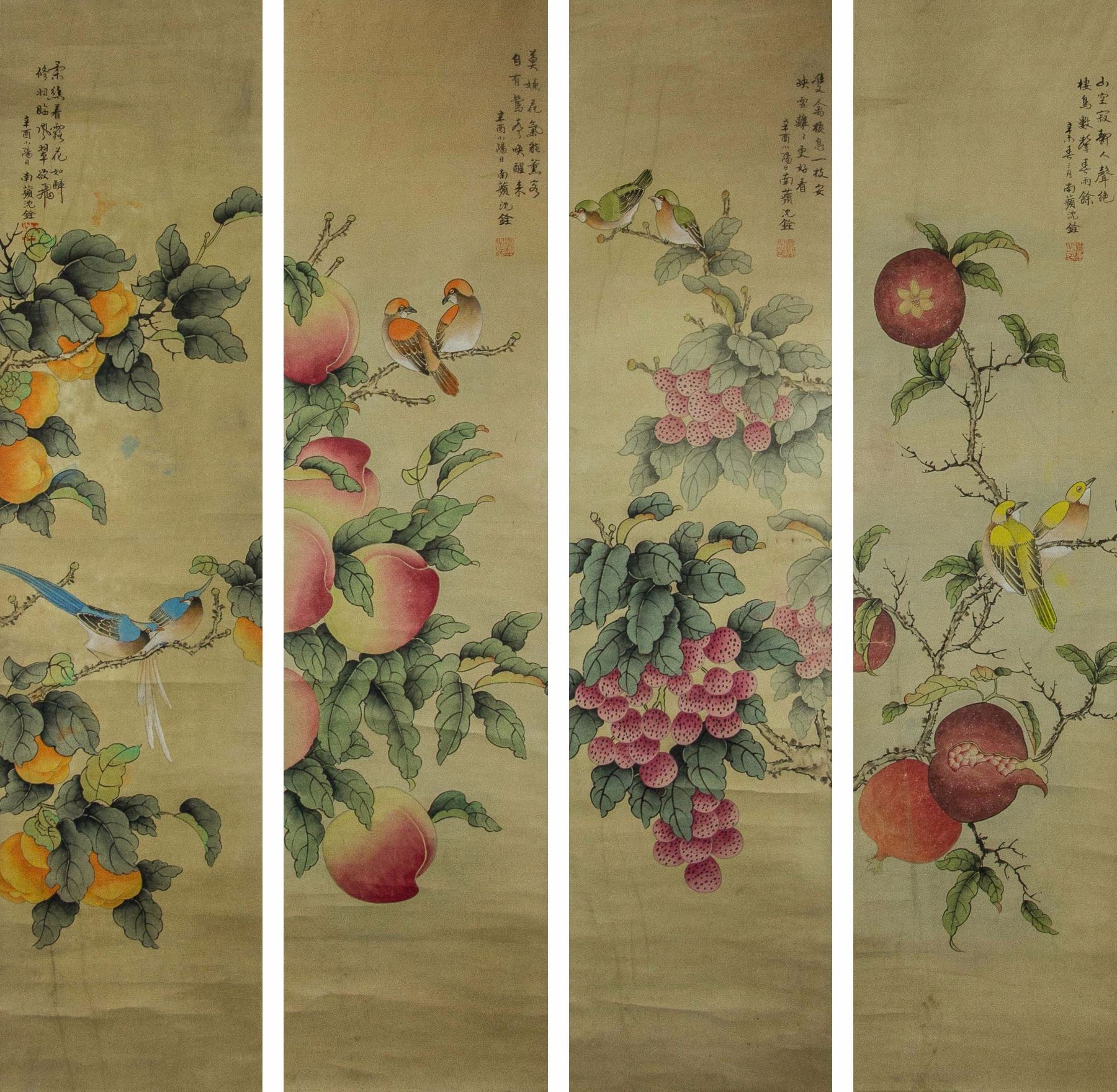 Four pieces of painting, depict orioles standing on trees of pomegranate, peach, persimmon and lychee; Chinese ink and watercolour on paper; hanging scroll; signed Shen Quan (1682-1760); each one inscribed one artist seal; 190 cm × 50 cm