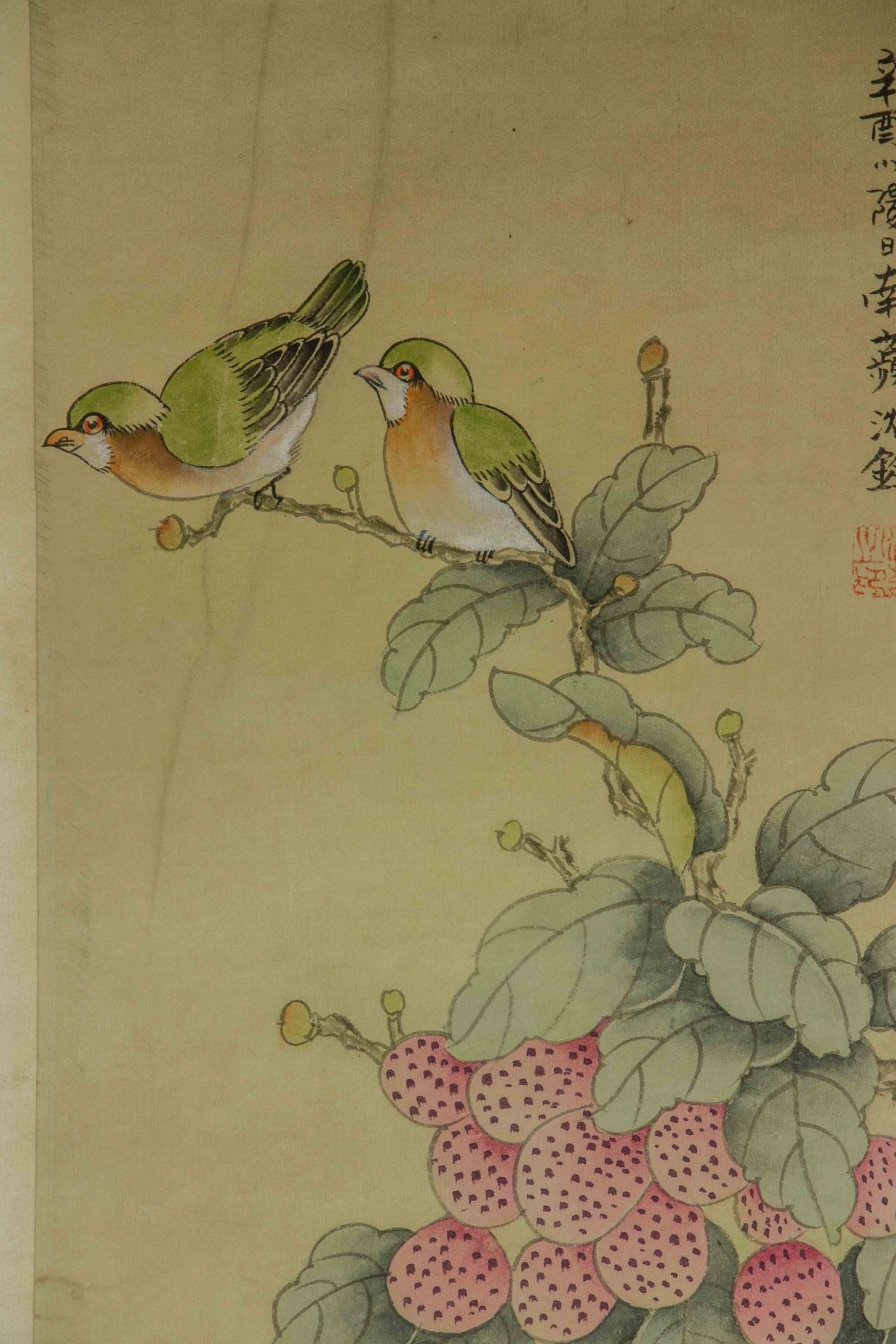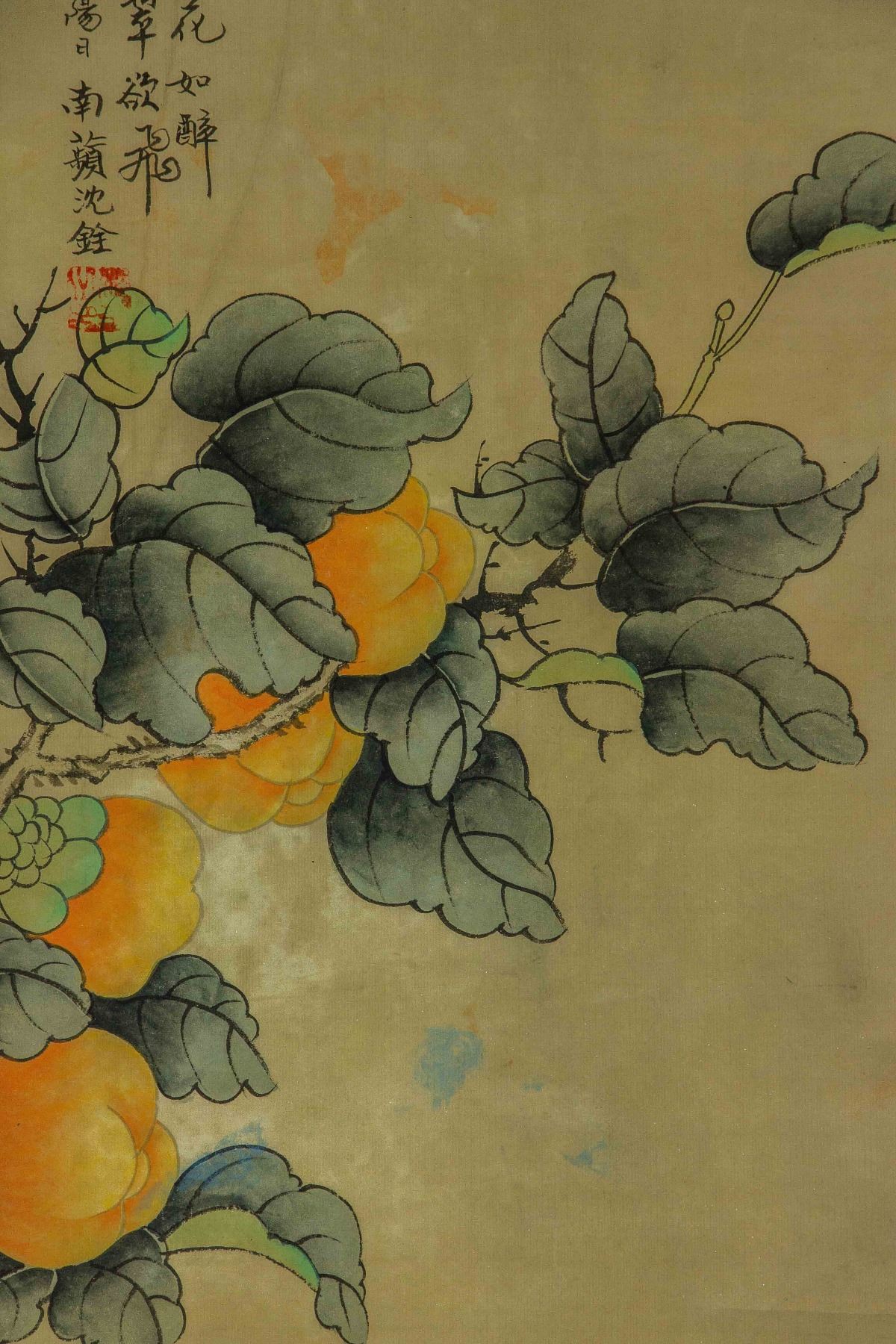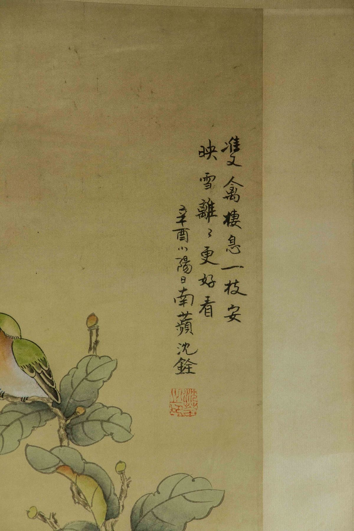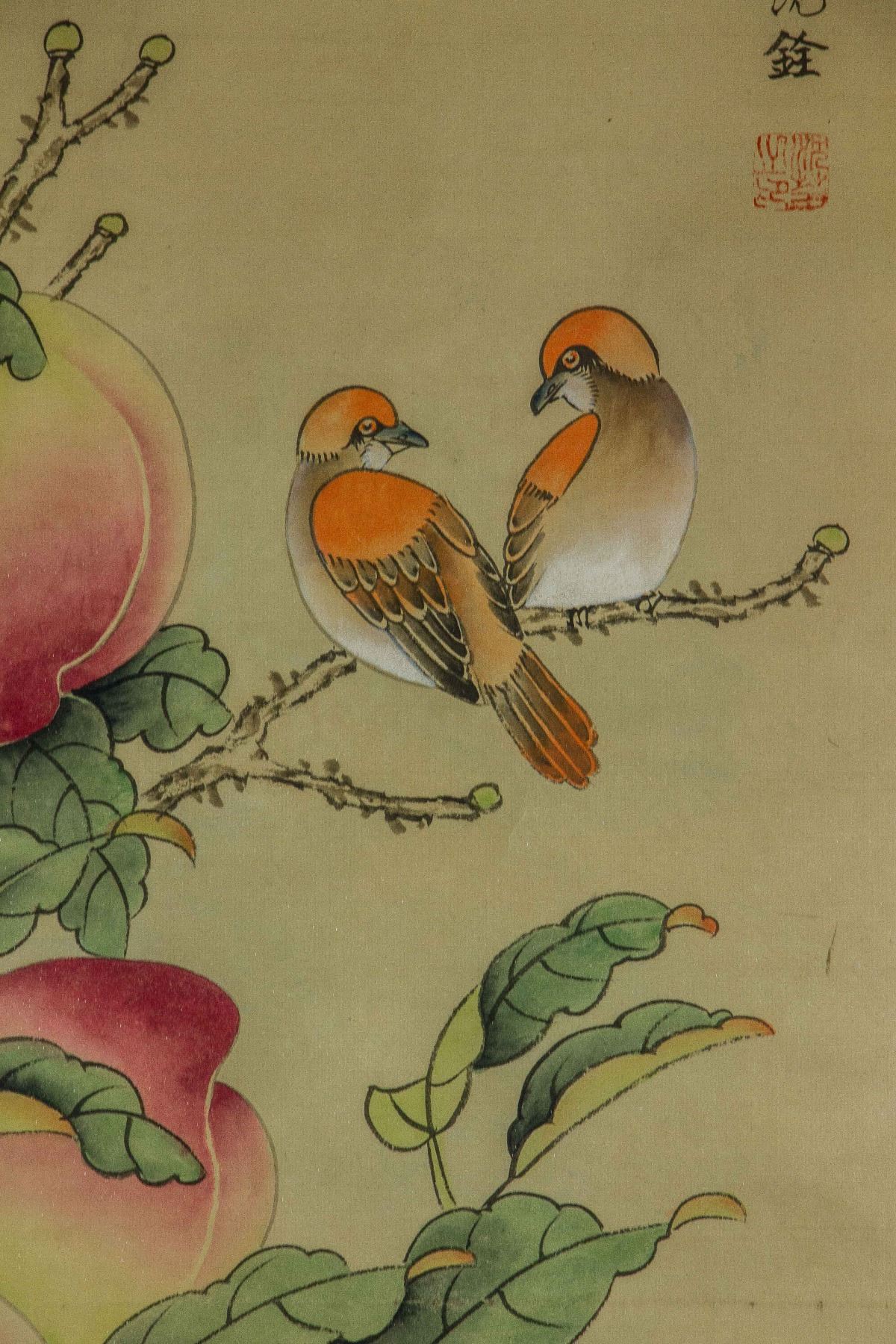 Four pieces of painting, depict orioles standing on trees of pomegranate, peach, persimmon and lychee; Chinese ink and watercolour on paper; hanging scroll; signed Shen Quan (1682-1760); each one inscribed one artist seal; 190 cm × 50 cm