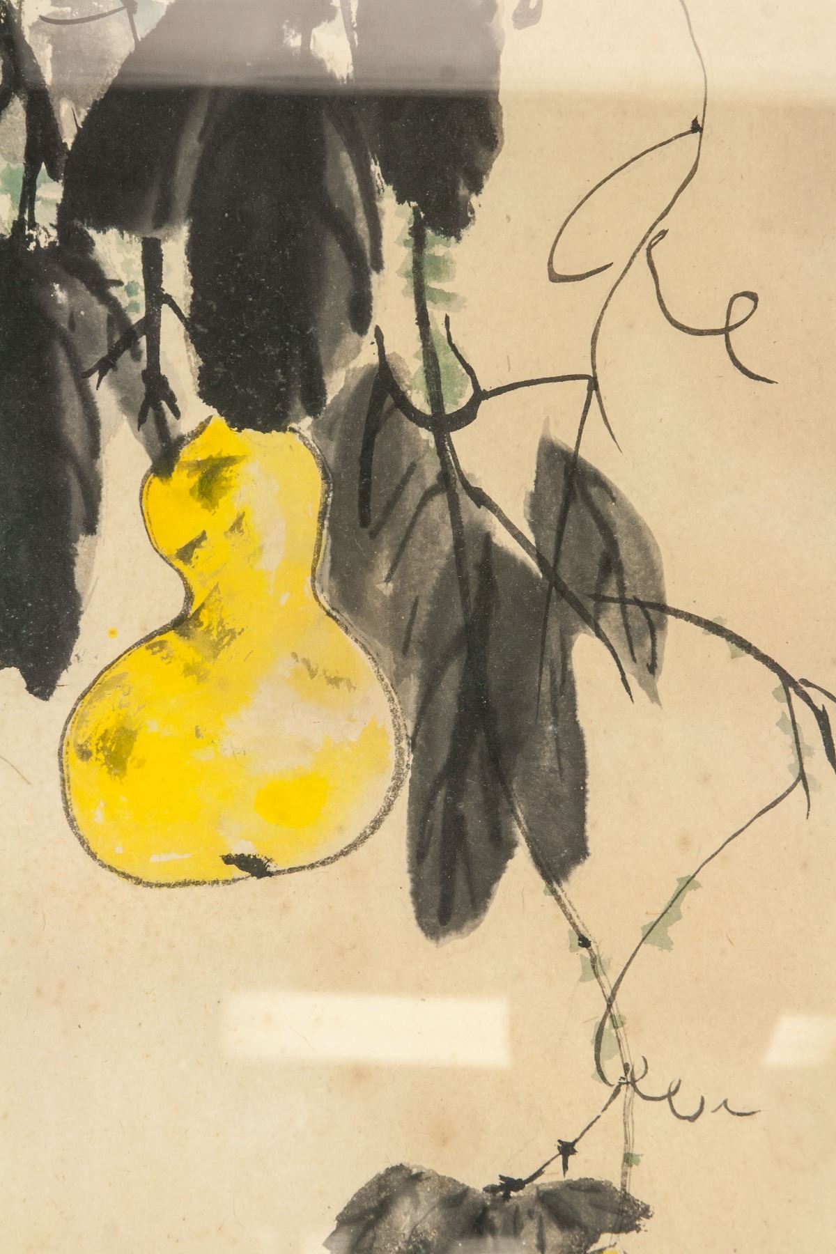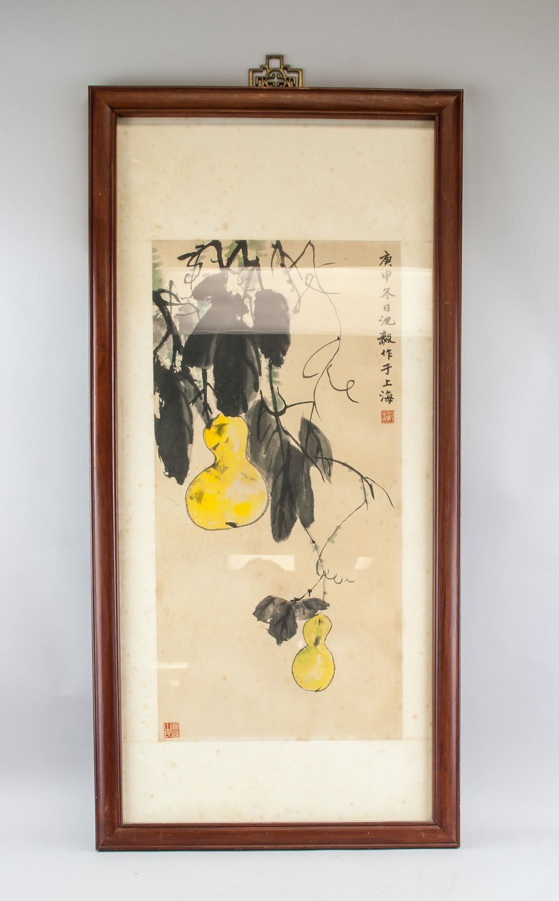 Painting of two gourds; watercolour on paper; framed; signed Shen Yi; inscribed with 2 artist seals; 67 cm x 33 cm