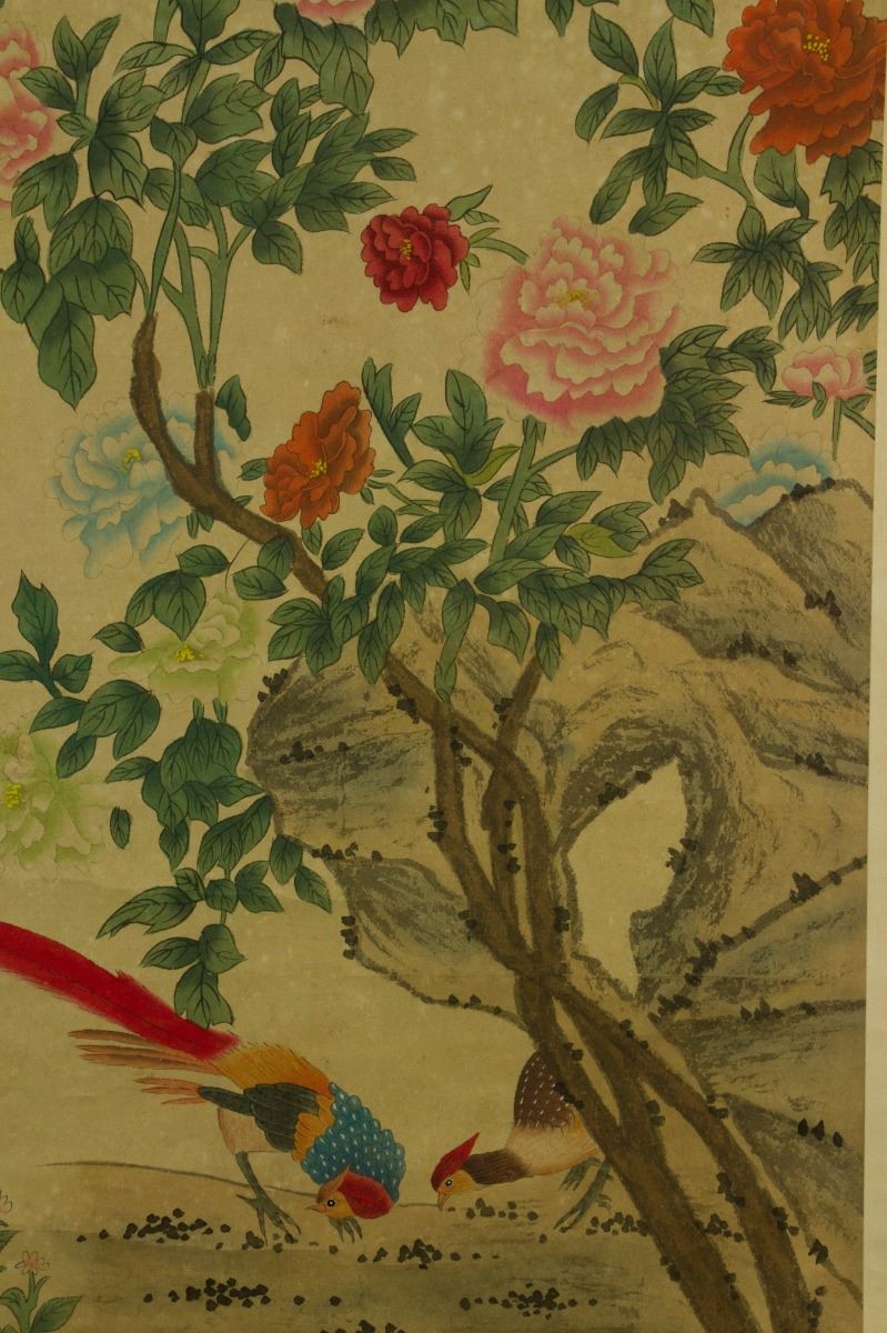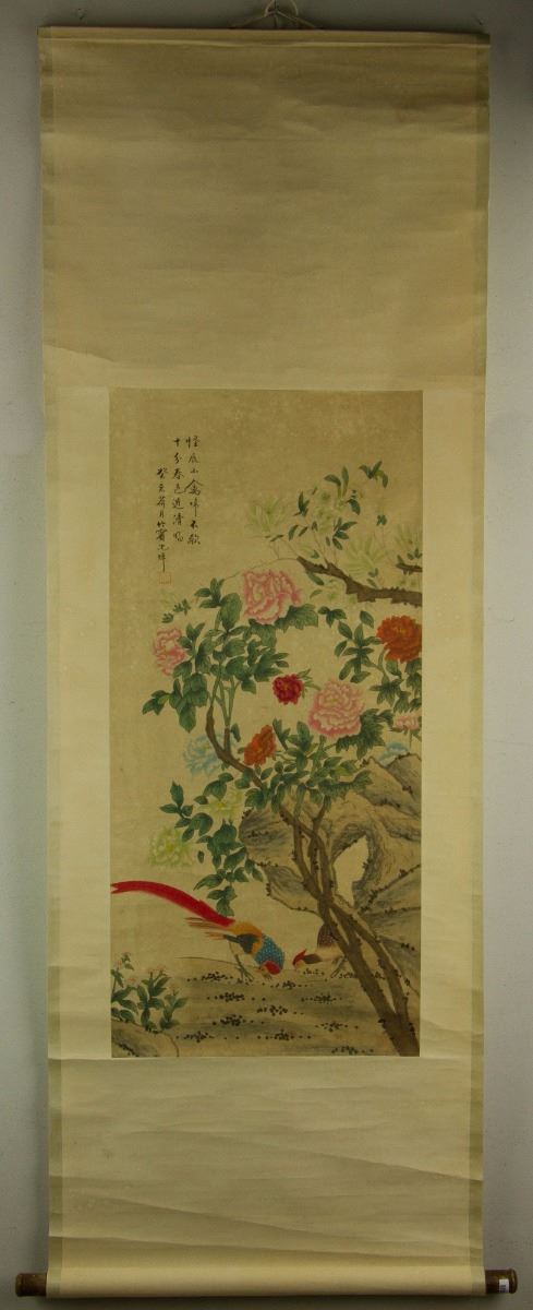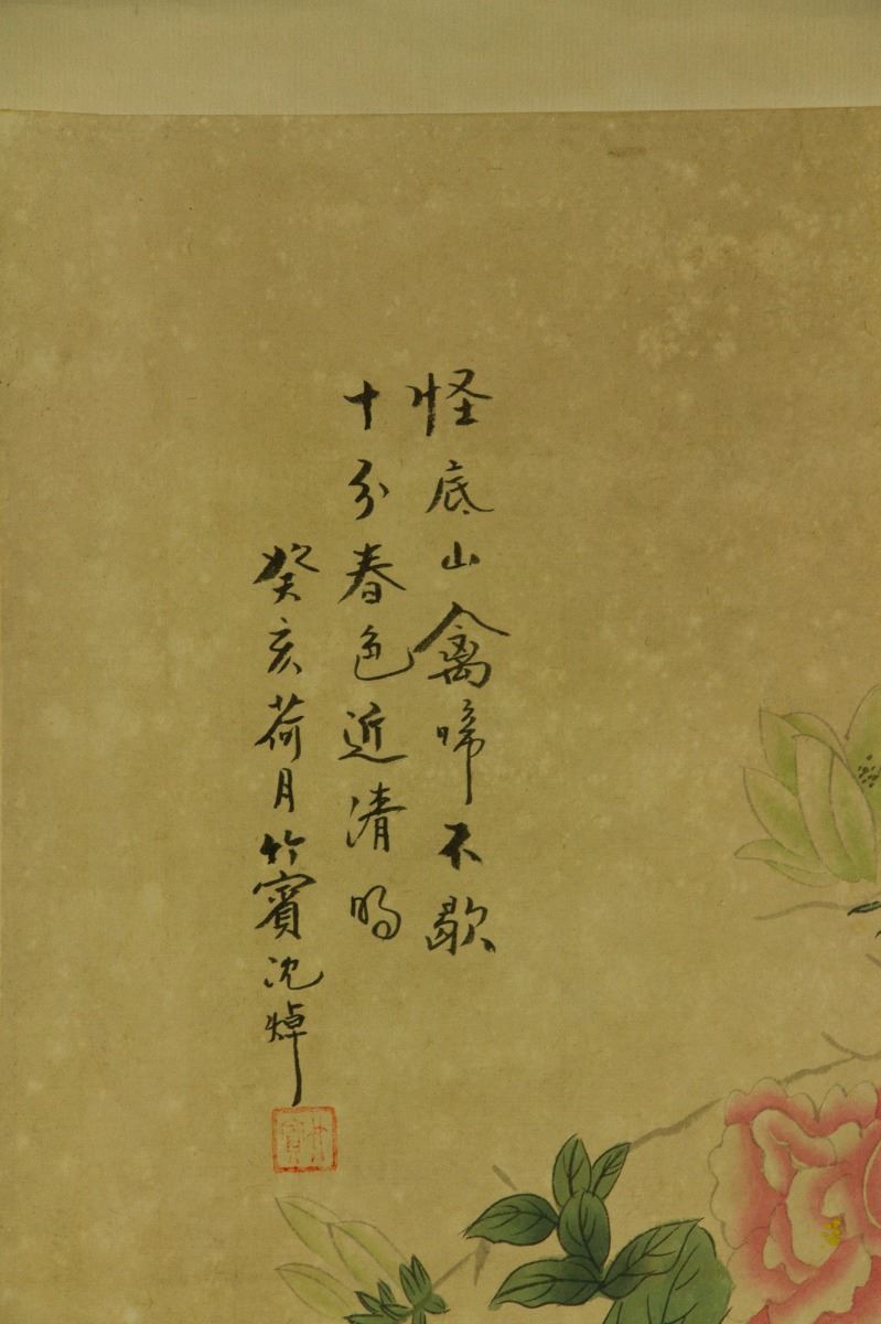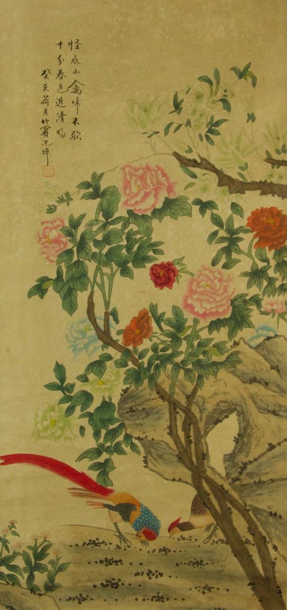 Pheasants underneath cluster of peonies; Chinese ink and watercolour on paper; hanging scroll; signed Shen Zhuo (?-1901); inscribed with one artist seal; 89 cm × 42 cm