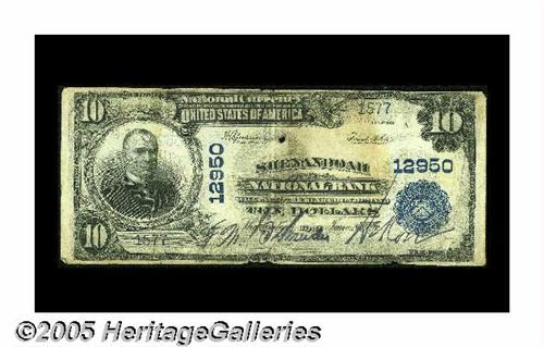 <B>Shenandoah, IA</B></I> - $10 1902 Plain Back Fr. 635 <B>Shenandoah NB</B></I> Ch. # 12950<BR>This scarce note comes from an institution whose documented population in large now aggregates only three pieces. The <B>Very Good</B></I> example we offer tonight last appeared on the market in our 2004 FUN auction, where it went for $1,200. Signed by the Vice President, it was clearly held for some time in a cash hoard, as transfer from a $5 1914 Federal Reserve Note is evident on the face. There is a bit of margin roughness and a small hole at center. This scarce item should sell for just about the level it reached when last offered, perhaps a bit more.