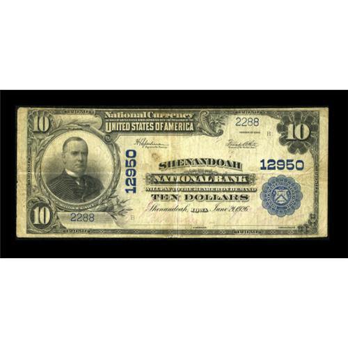 <B>Shenandoah, IA</B></I> - $10 1902 Plain Back Fr. 635 <B>Shenandoah NB</B></I> Ch. # 12950<BR> A total of four large size notes are known from this Page County issuer. This piece has solid paper save for some minor ticks in the left margin. Only 3,072 pre-1929 sheets were printed for this bank. The purple signatures have faded, but are still visible on this rare note. <B>Fine.</B></I><BR><BR><b>Shipping:</b> Coins & Currency (<a target="_blank" href="http://www.heritageauctions.com/common/shipping.php">view shipping information</a>)