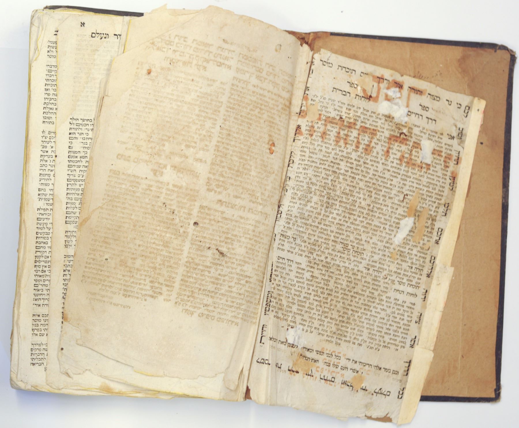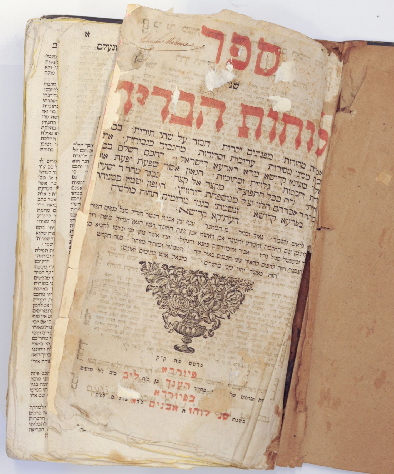 Shenei Lu?ot HaBerit by Isaiah ben Abraham Horowitz (the Holy Shla), F?rth, 1764, 2, 421 [supposed to be 420] pages. 32 cm. Bound together with the book Vavei HaAmudim, an introduction to the Shla by the author’s son, Shabtai ben Yeshaya Horwitz. 8, 8-44 [supposed to be 36] 4. Reasonable condition: loose binding in the front and back, title page a bit damaged (has been repaired at the edges), the rest of the book is in good condition: some loose pages. yellowing pages. Has presumable been rebound.