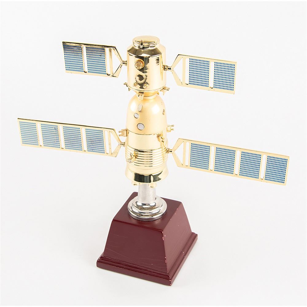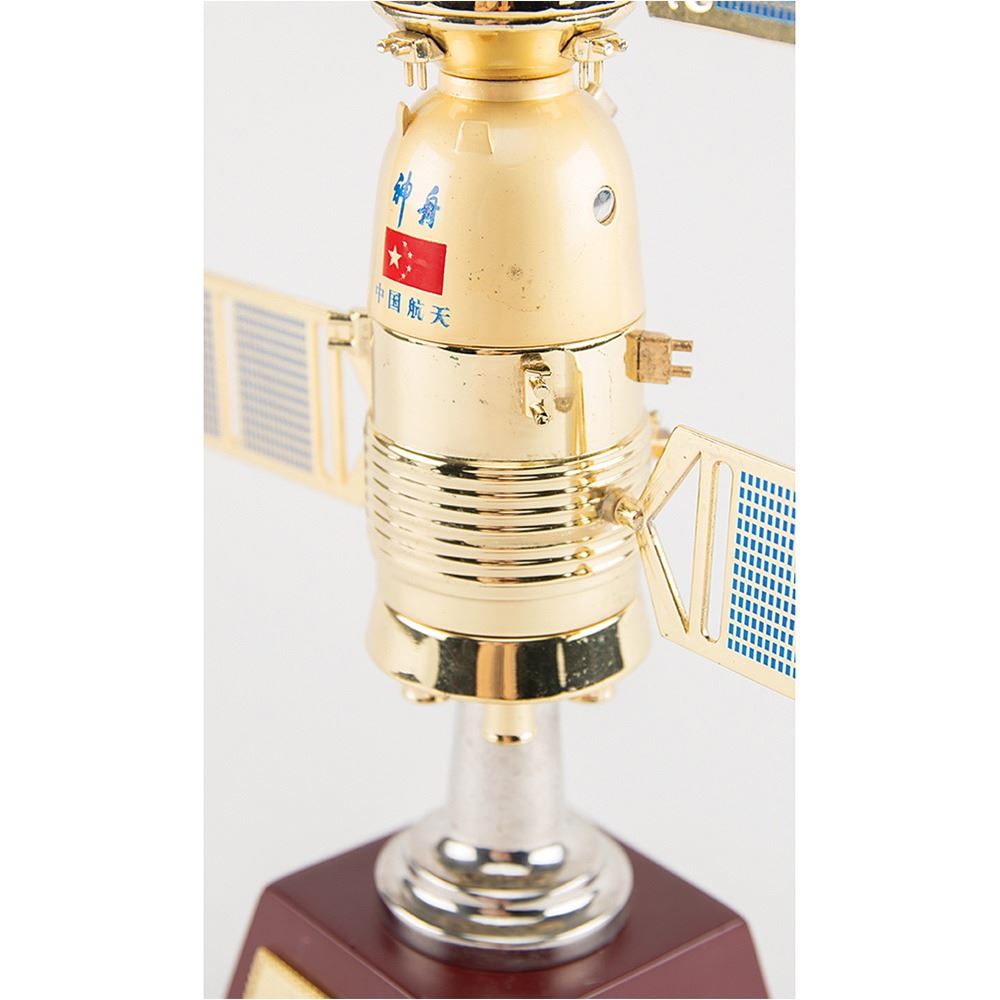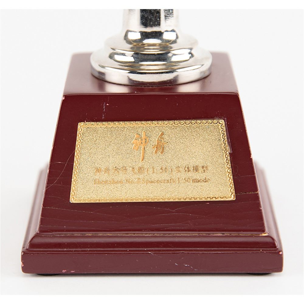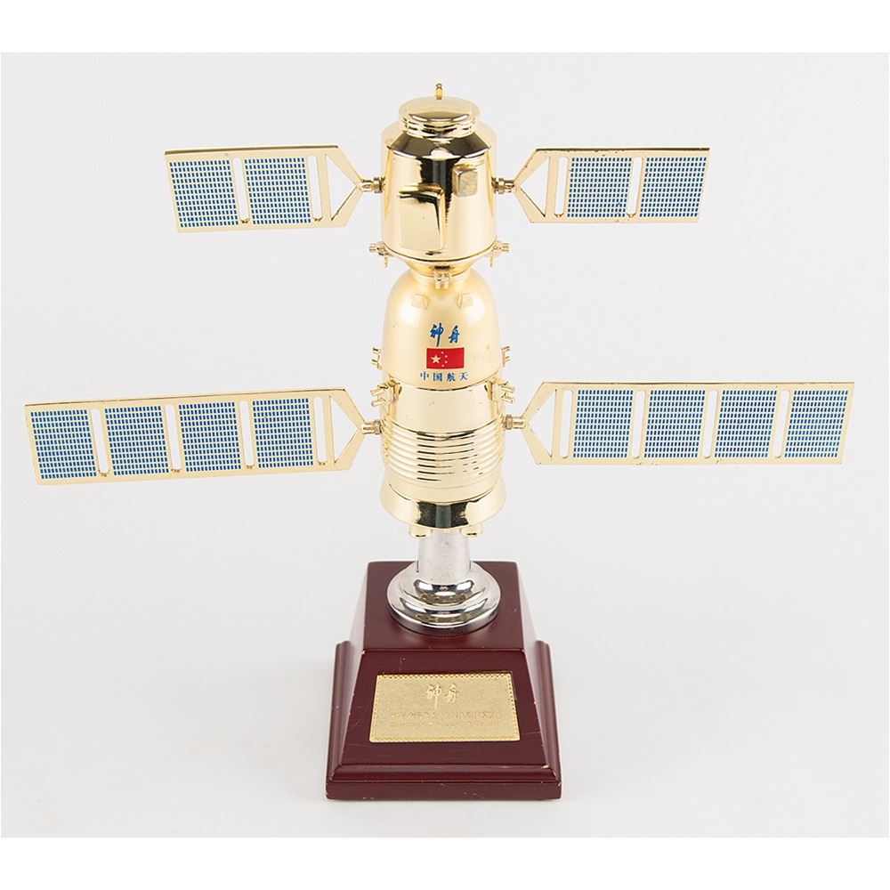 Striking 1:50 scale model of the Shenzhou 6 spacecraft, the second human spaceflight of the Chinese space program, which launched on a Long March 2F rocket from the Jiuquan Satellite Launch Center on October 12, 2005. The gold-tone metal model, which stands 11.5è tall and 12.5è wide, features the orbital, service, and reentry modules with four deployed solar panels. The model is set upon a base with an affixed plaque bearing raised Chinese and English text. In fine condition, with some light scuffs and marks to model; several thin lines of cracking to paint on base.