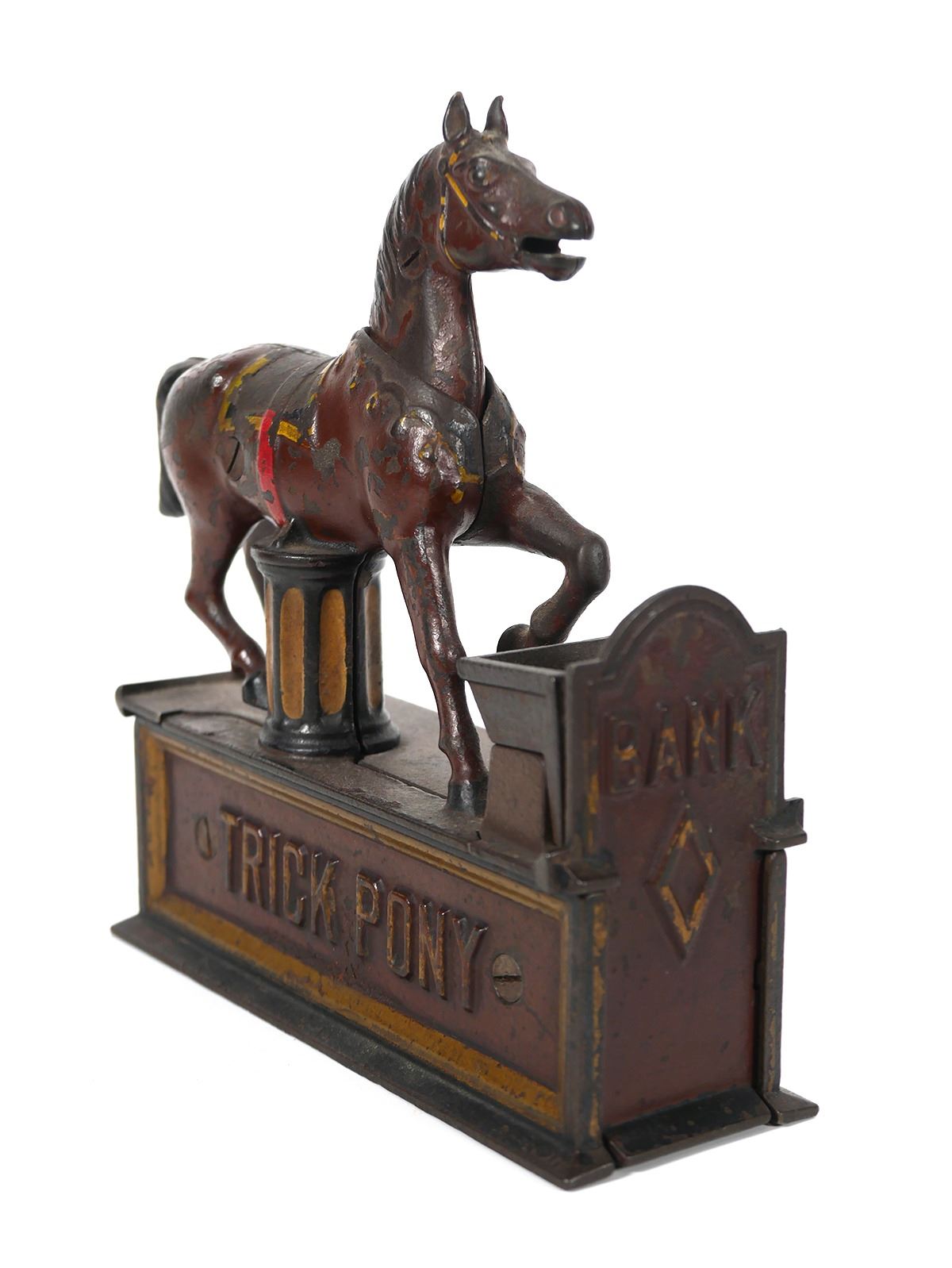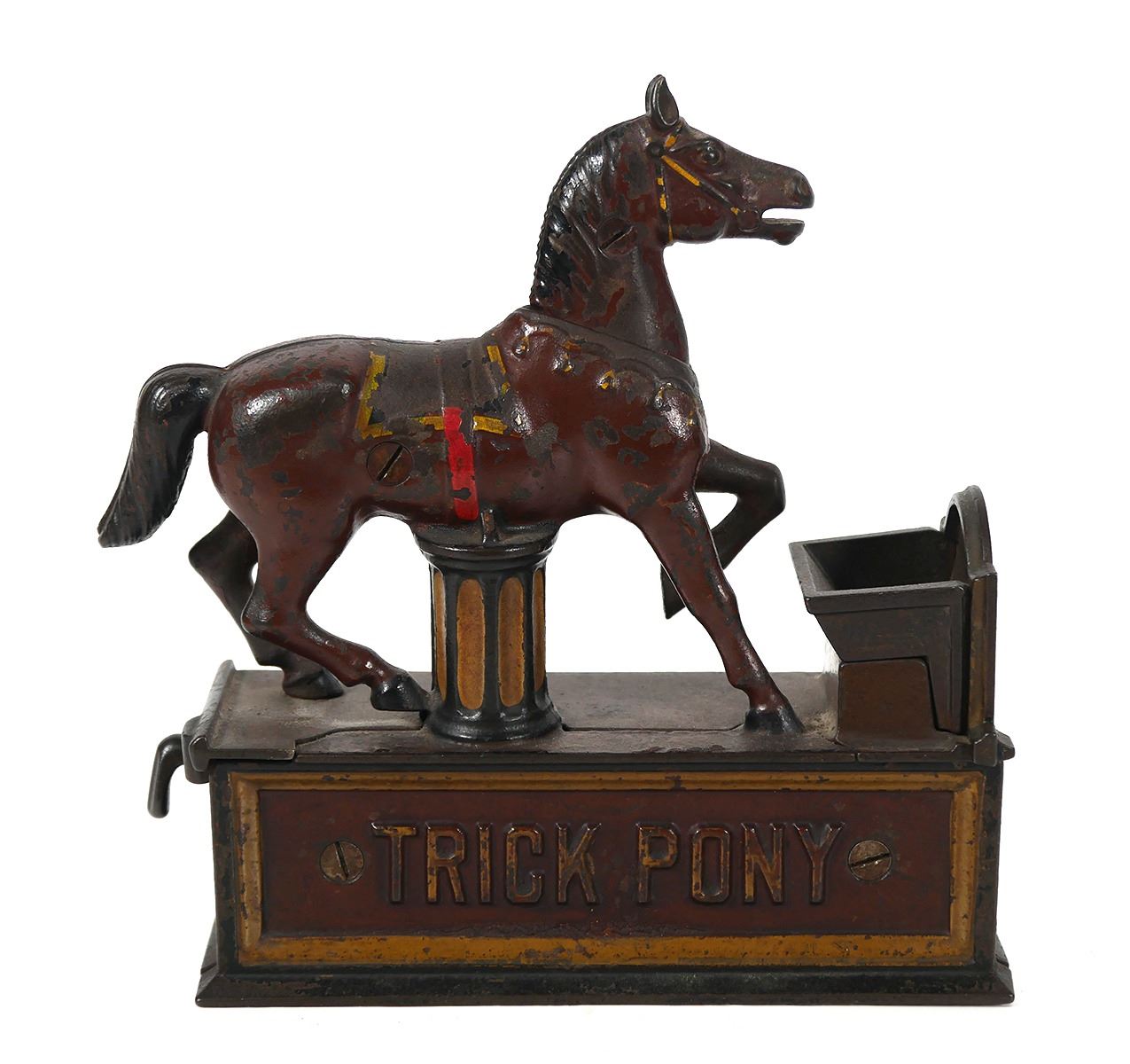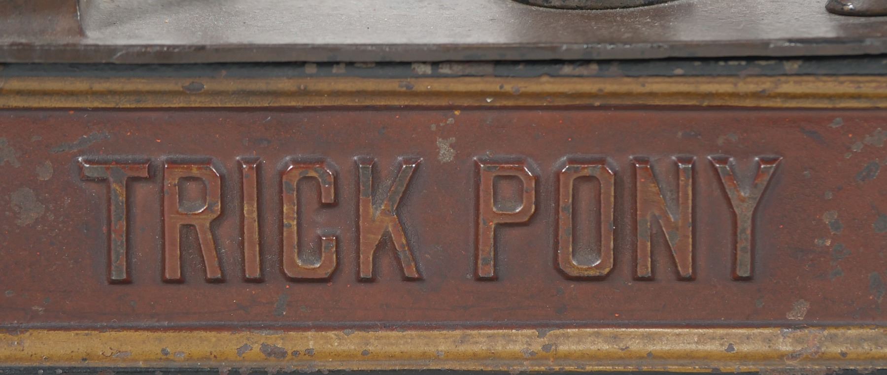 Shepard Hardware Co. Cast Iron Trick Pony Mechanical Bank, circa 1880s. Excellent condition with minor surface wear. Measures approximately 7 3/4" tall x 7 1/2" long x 2 1/2" deep.