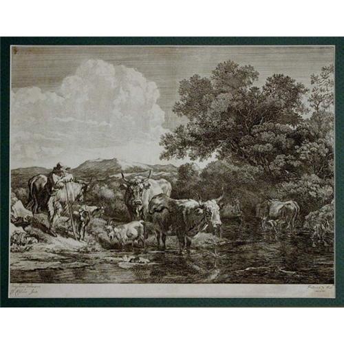 Very old engraving depicting a standing shepherd resting with his herd. Text printed on the page reads in Latin as follows: Berghem deliniavit, J. Vischer fecit, Frederick de Widt excudit. There is a handwritten text on the reverse written in German, appears to be the title. Nicolaes Berchem (c.1620-1683) was the adopted name of a Dutch school classical artist (son of Pieter Claesz) known for his scenes of Italian landscapes, peasants and cattle. In good used condition with center crease and toning as shown. Please ask questions, request additional photos and shipping costs before buying.