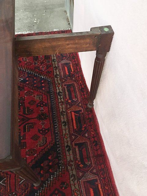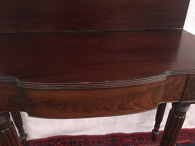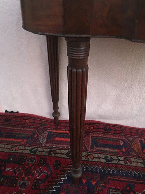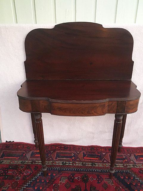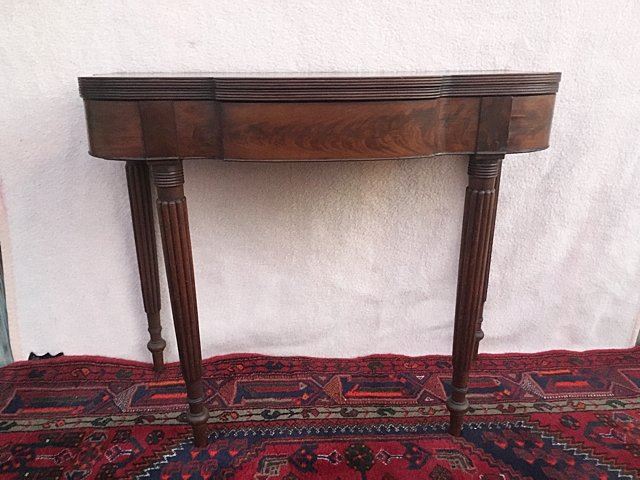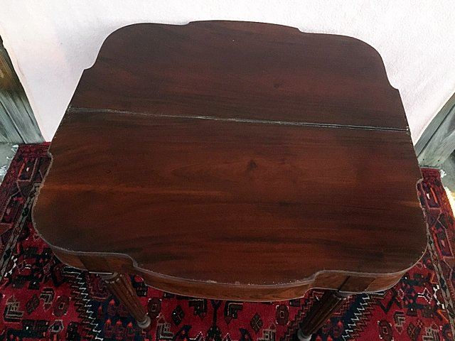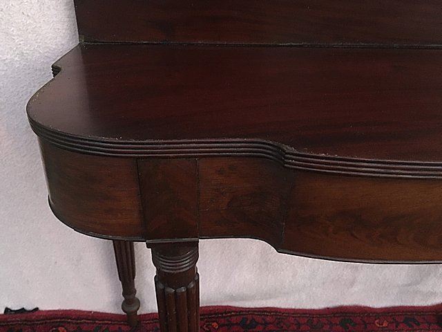 Sheraton lift top game table with reeded legs. Swing leg, opens to turtle top, all legs are reeded with reeded table edging. Measures approx. 35" wide x 29" high x 17 1/2" closed depth.
