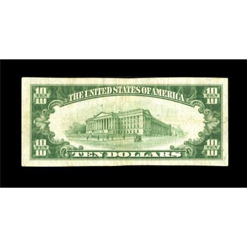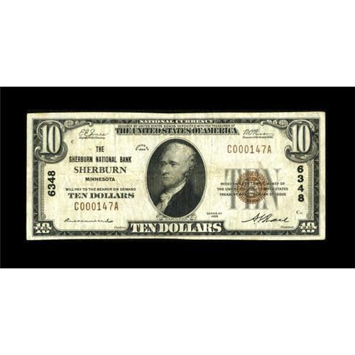 <B>Sherburn, MN</B></I> - $10 1929 Ty. 1 <B>The Sherburn NB</B></I> Ch. # 6348<BR> A very rare small size example from the sole bank to issue in this Martin County hamlet. Only six small size notes are reported in the census. <B>Fine+.</B></I><BR><I>From The Kansas City Collection.</B></I><BR><BR><b>Shipping:</b> Coins & Currency (<a target="_blank" href="http://www.heritageauctions.com/common/shipping.php">view shipping information</a>)