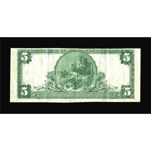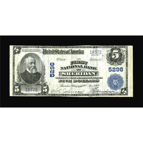 <B>Sheridan, IN</B></I> - $5 1902 Plain Back Fr. 607 <B>The First NB</B></I> Ch. # 5296<BR> The second title used by this just plain rare bank. Other than a single Brown Back bearing the first title which has never been publicly offered, this new to the census specimen is by far the nicest example known from this large size only institution. Track and Price shows only one offering of any kind from here at public sale since a 1985 auction appearance. <B>Very Fine-Extremely Fine.</B></I><BR><BR><b>Shipping:</b> Coins & Currency (<a target="_blank" href="http://www.heritageauctions.com/common/shipping.php">view shipping information</a>)