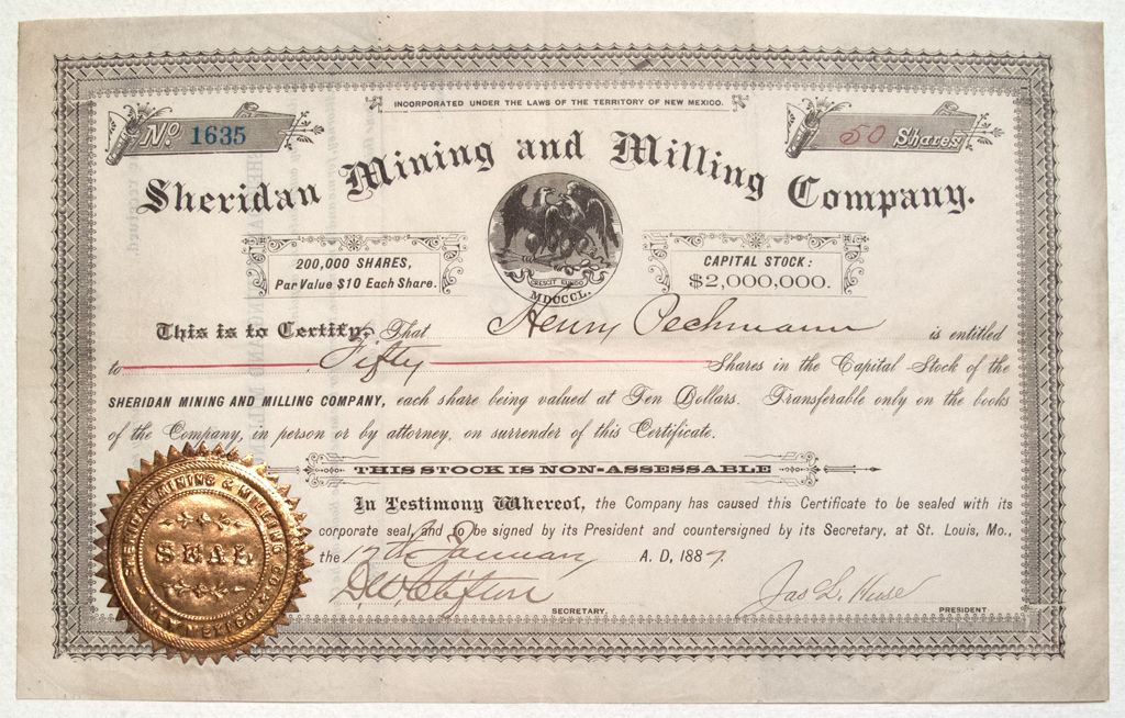 Cert # 1635 for 50 shares issued to Henry Pachmann. Signed by D W Caifure & Jas L Huse.