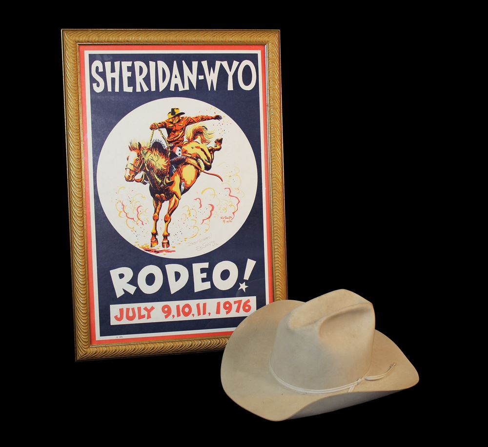 Original resistol hat belonging to rodeo rider Ed Smyth, accompanied by an original 1976 Sheridan Wyoming rodeo poster.
