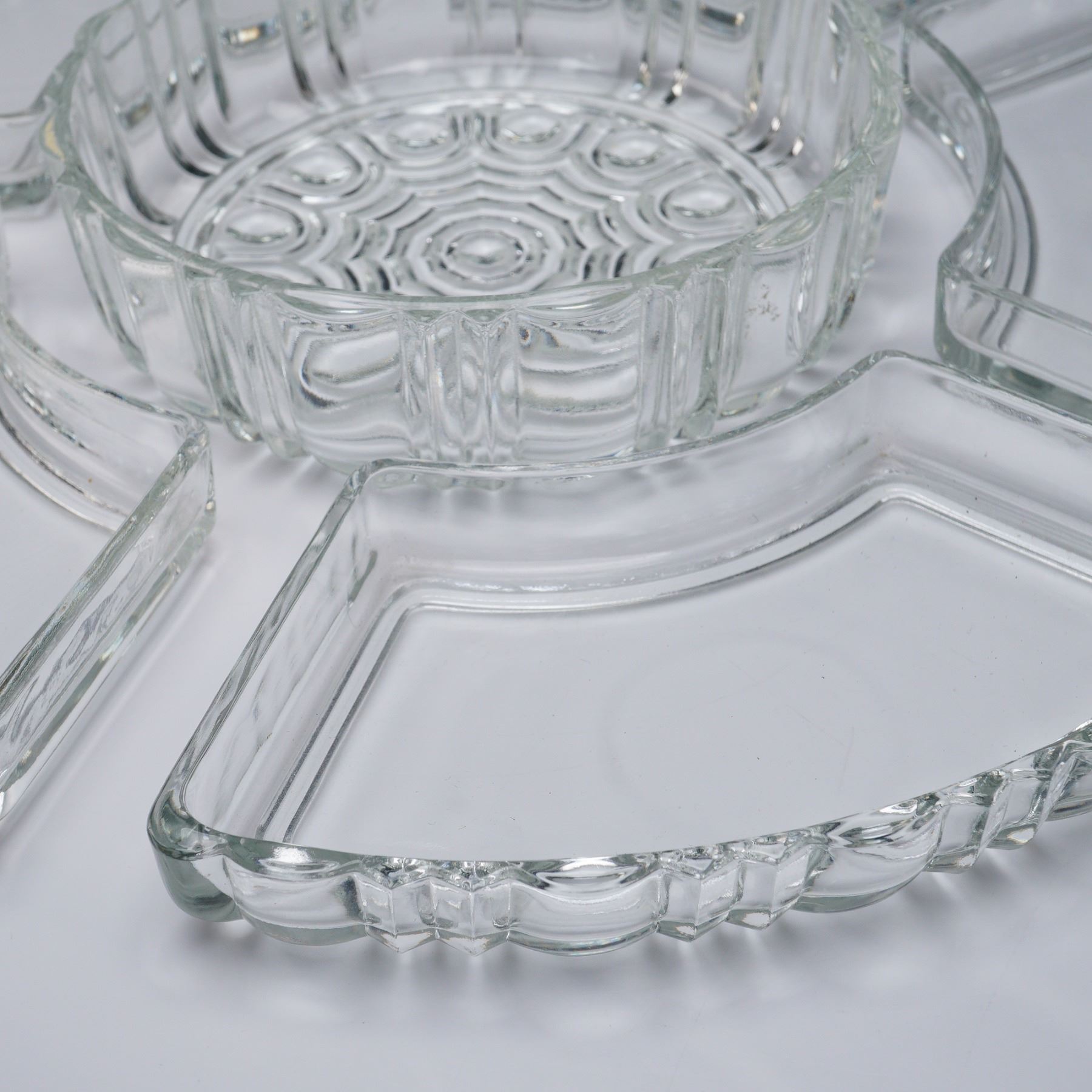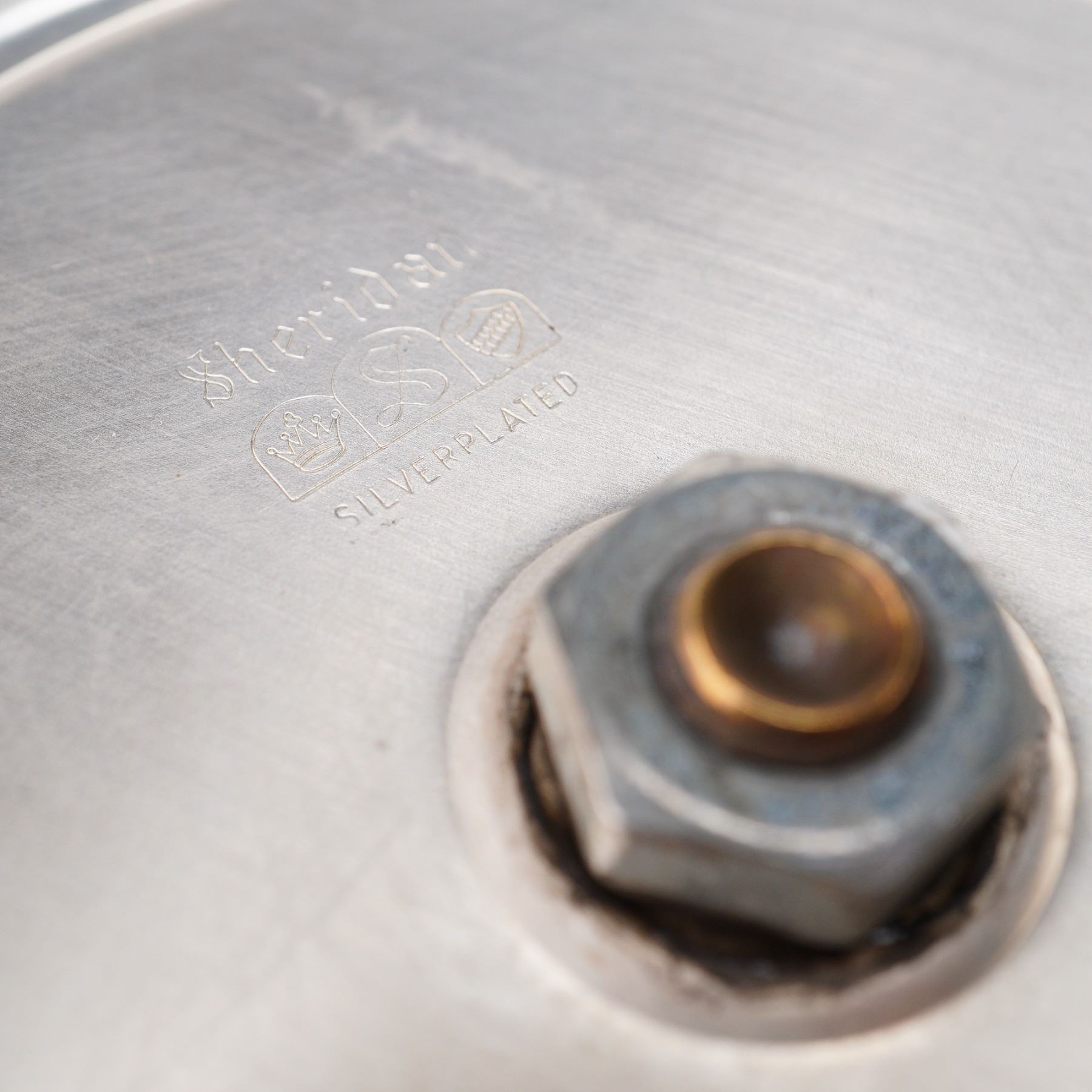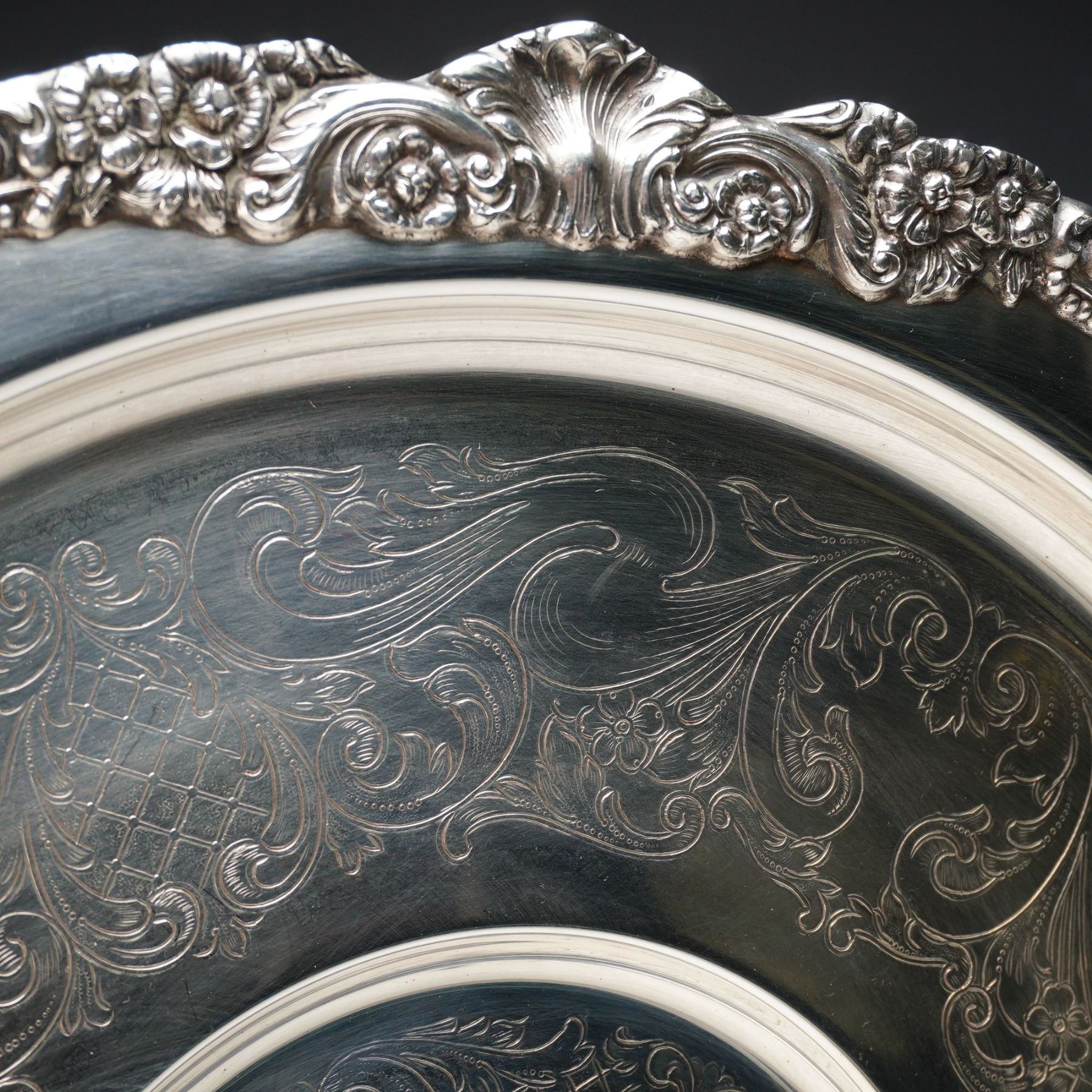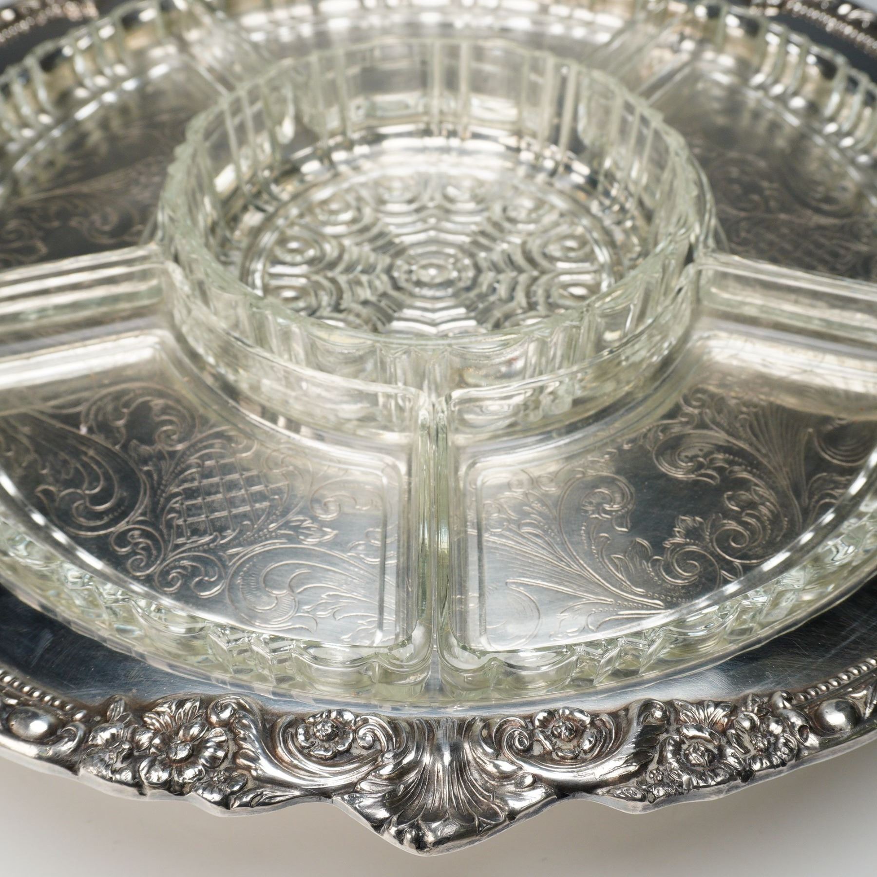 Elegant rotating silverplated serving tray by Sheridan Silver Company, featuring a finely engraved floral and scroll pattern with raised rococo-style rim detailing. The divided pressed glass insert includes a central bowl surrounded by five compartments, perfect for serving appetizers or condiments. Marked "Sheridan Silverplated" with the crown, S, and shield hallmark on the underside. A timeless and functional mid-century entertaining piece combining beauty and practicality.