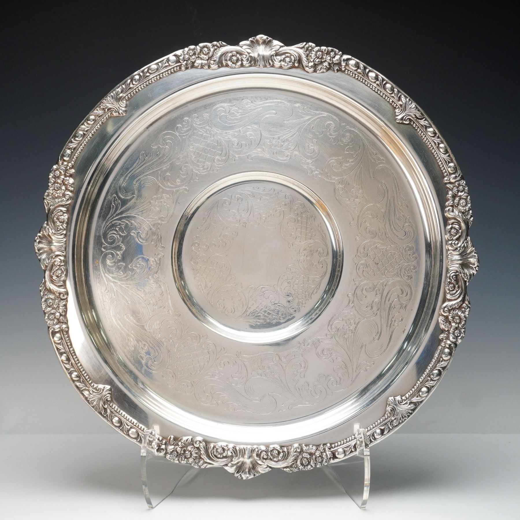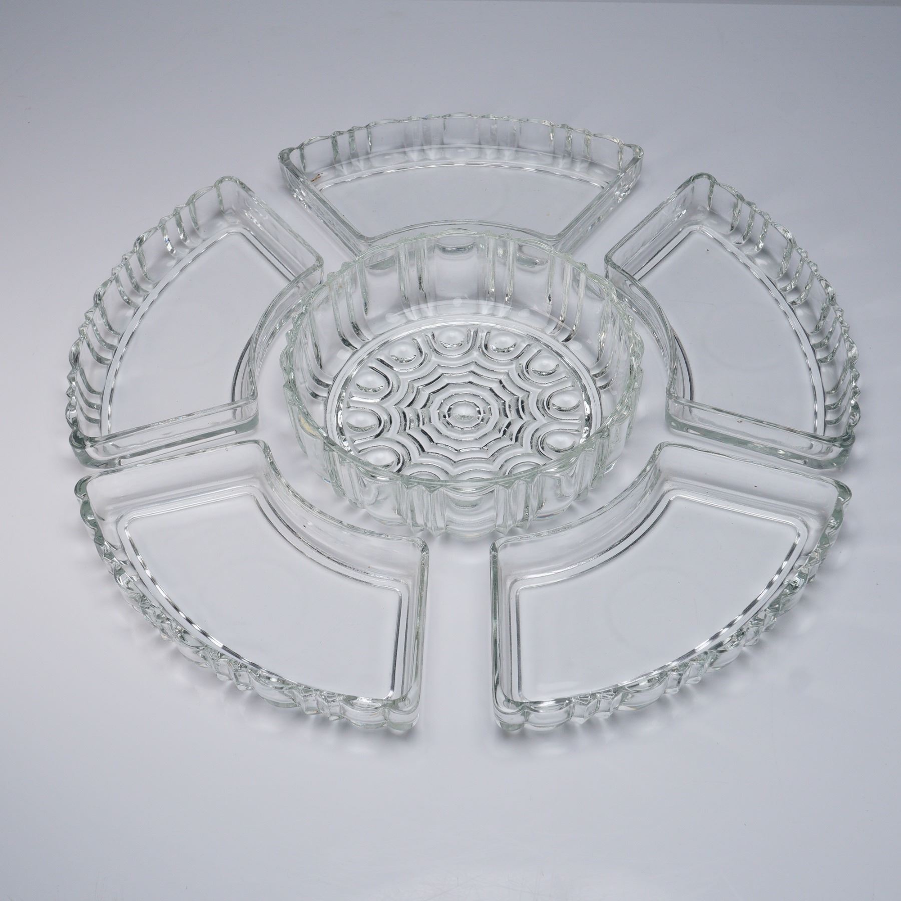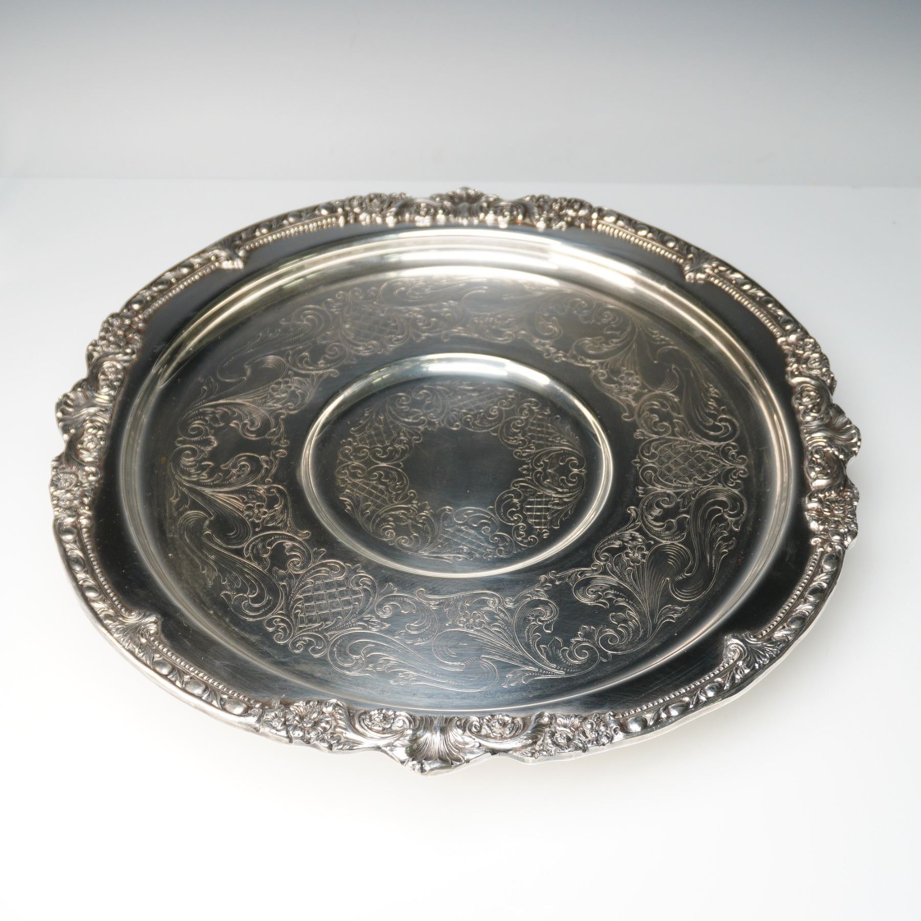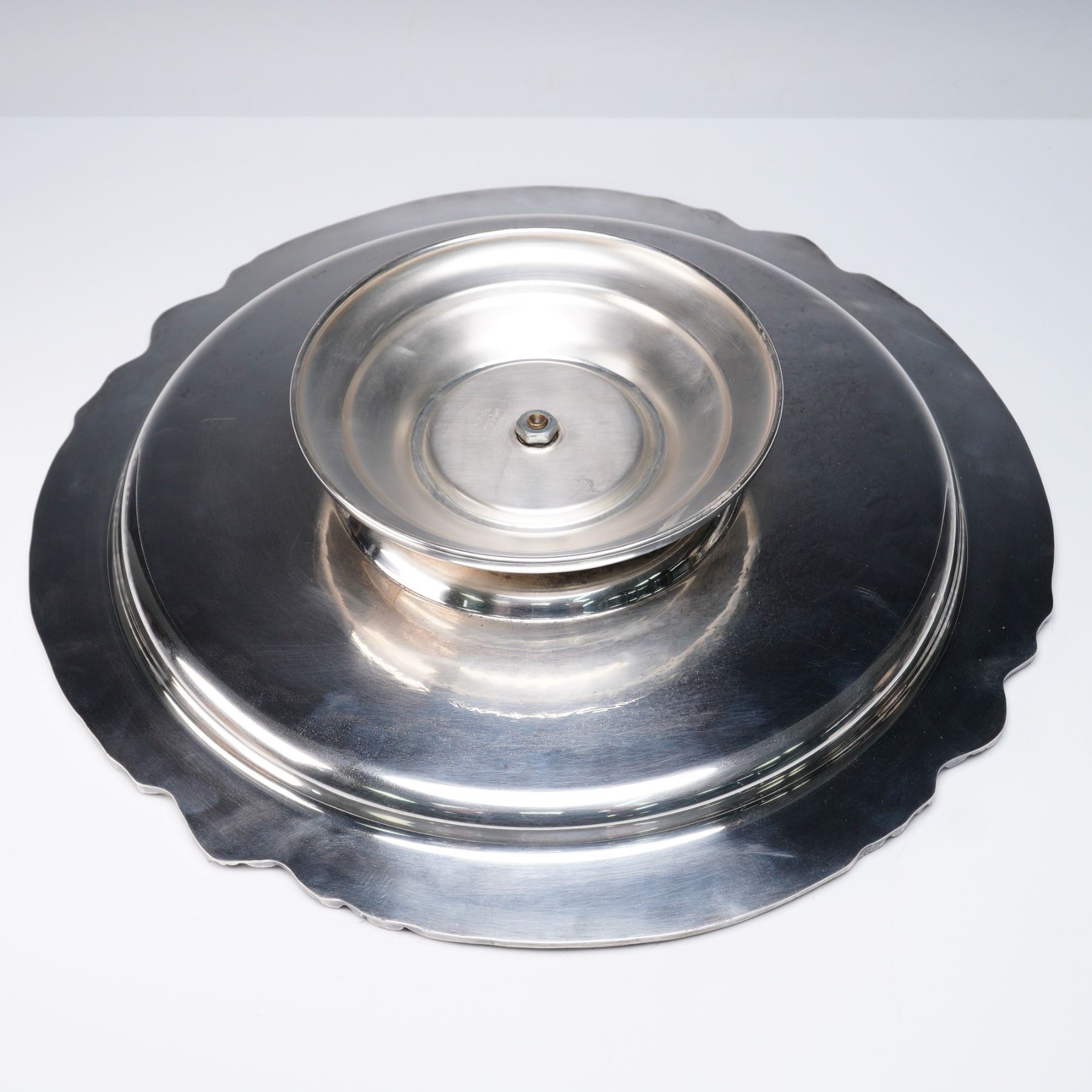 Elegant rotating silverplated serving tray by Sheridan Silver Company, featuring a finely engraved floral and scroll pattern with raised rococo-style rim detailing. The divided pressed glass insert includes a central bowl surrounded by five compartments, perfect for serving appetizers or condiments. Marked "Sheridan Silverplated" with the crown, S, and shield hallmark on the underside. A timeless and functional mid-century entertaining piece combining beauty and practicality.