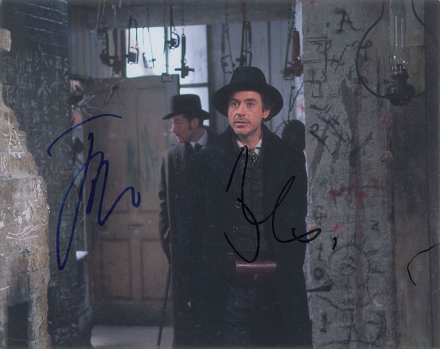 Color satin-finish 10 x 8 photo of Sherlock Holmes and Dr. John Watson from the 2009 Guy Ritchie film, signed in black felt tip by Robert Downey Jr., and in blue felt tip by Jude Law. In fine condition.