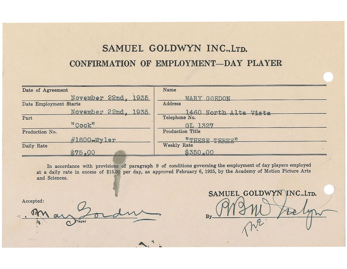 Scottish-born actress (1882–1963) best known for her role as landlady Mrs. Hudson in the Sherlock Holmes movies of the 1930s and 1940s. She also had several bit roles in Universal’s Frankenstein, Bride of Frankenstein, The Invisible Man, and The Mummy’s Tomb. DS, one page, 8.25 x 5.5, November 22, 1935. Samuel Goldwyn Inc., Ltd, Day player agreement for Gordon to appear in the part of the “Cook,” in the production entitled “These Three,” for a daily rate of $75 and a weekly rate of $350. Signed at the bottom by Gordon. In fine condition, with punch holes to right edge, an ink spot above signature and some stray ink marks along bottom edge.