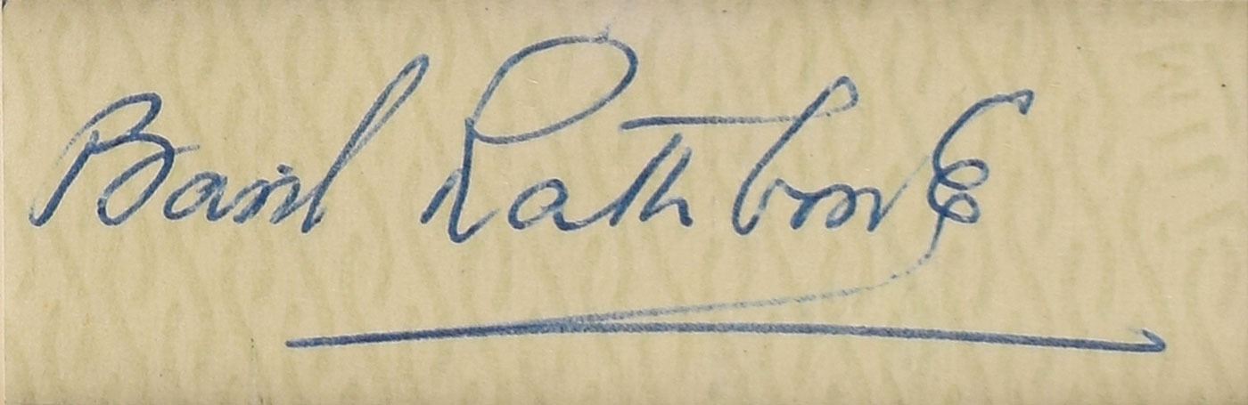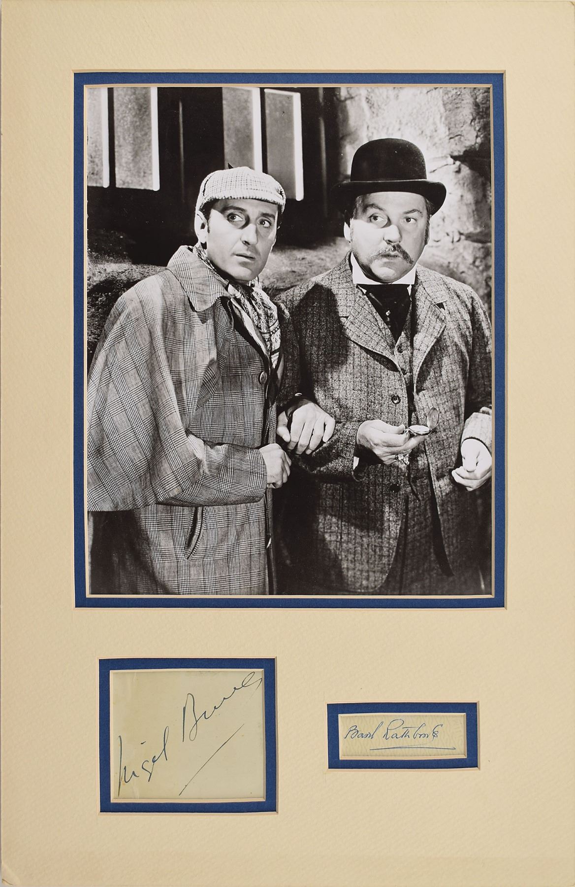 Ballpoint signature, "Basil Rathbone," on an off-white 2.25 x .75 slip, and a fountain pen signature, "Nigel Bruce," on an off-white 3 x 2.5 sheet, both of which are double-matted with a photo of the actors as Holmes and Watson to an overall size of 11 x 17. In fine condition, with some light creasing to Bruce.