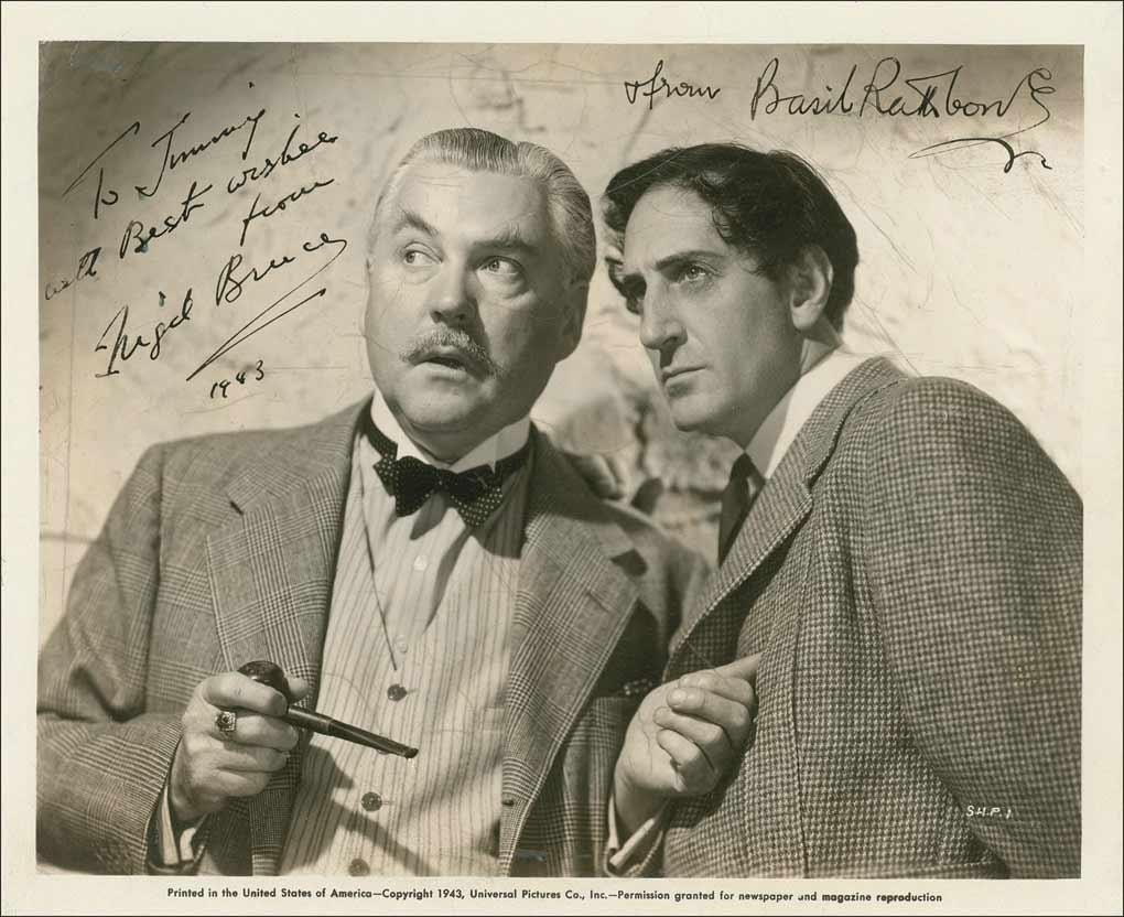 Vintage 10 x 8 photo of Holmes and Watson from one of the 1943 Sherlock Holmes films, signed and inscribed in fountain pen “To Jimmy with best wishes from Nigel Bruce 1943,” and “From Basil Rathbone.” The photo has been professionally and expertly restored to very good condition, re-backed to a heavier archival sheet, with moderate creases, bends, and surface marks and tears very neatly repaired to return the photo to a highly displayable state. Photos of Rathbone as Holmes or Bruce as Watson are seldom encountered; both in character on the same photo, essentially nonexistent. It may be years before you see another!