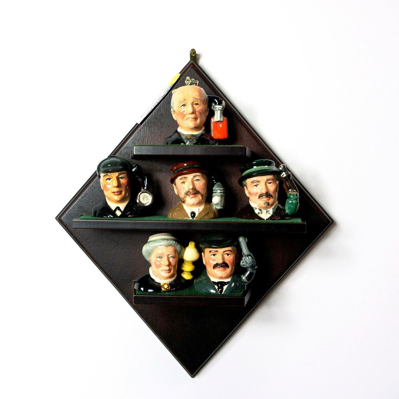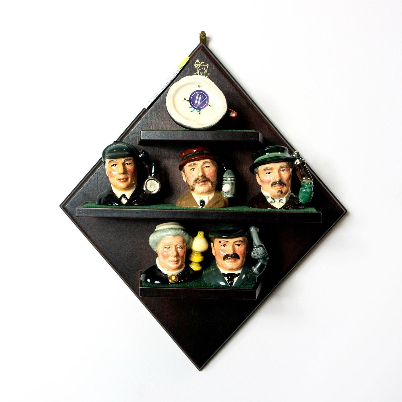 Royal Doulton Character Jug, Sherlock Holmes Set of 6 pieces with stand (Sherlock Holmes - Brown, white and grey; Doctor Watson - brown, white and grey; Mrs. Hudson - black, white and yellow; Professor Moriarty - black, white and green; Inspector Lestrade - brown, white and grey; Jefferson Hope - black, white and red). Designed by William K. Harper. Series: Tinies, issued 1995 in limited edition of 2,500. Size: 1.5"H (tiny)These six tiny character jugs were issued in a tribute to Sir Arthur Conan Doyle, the creator of Sherlock Holmes. They were released by Lawleys By Post in a limited edition of 2,500. Each set has matching edition numbers and was issued with a presentation stand.
