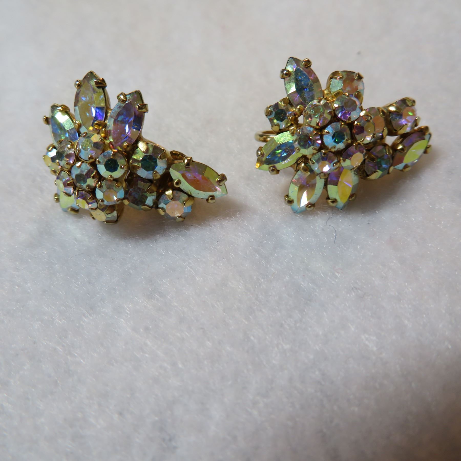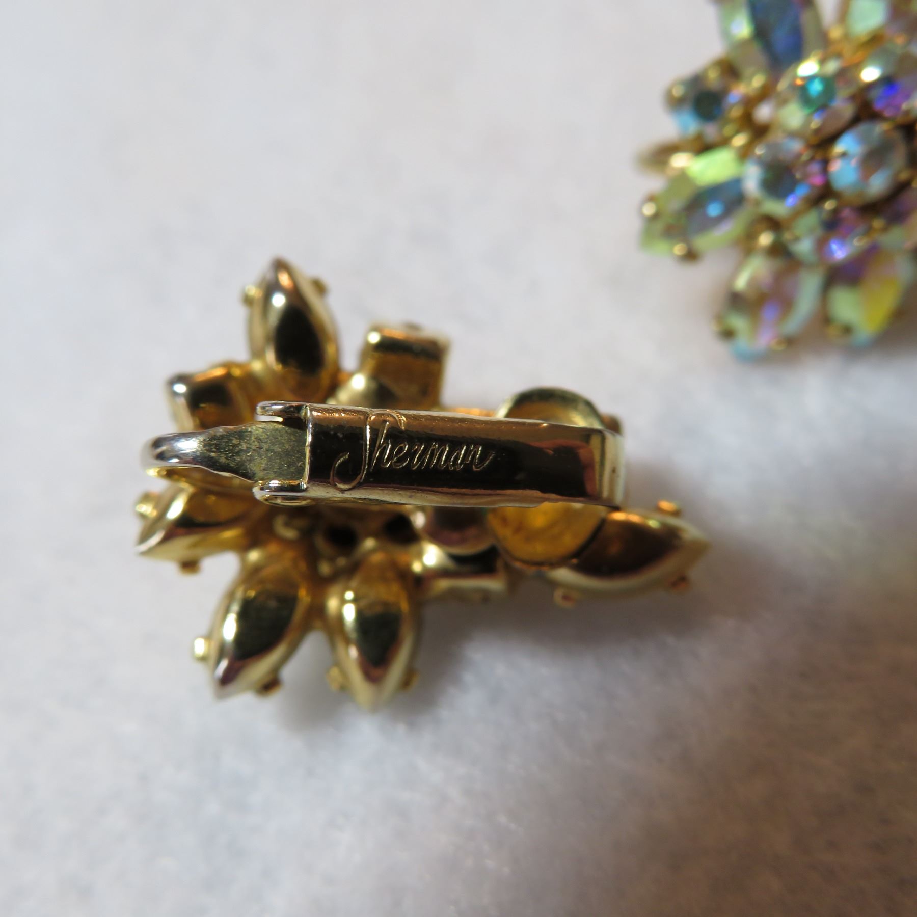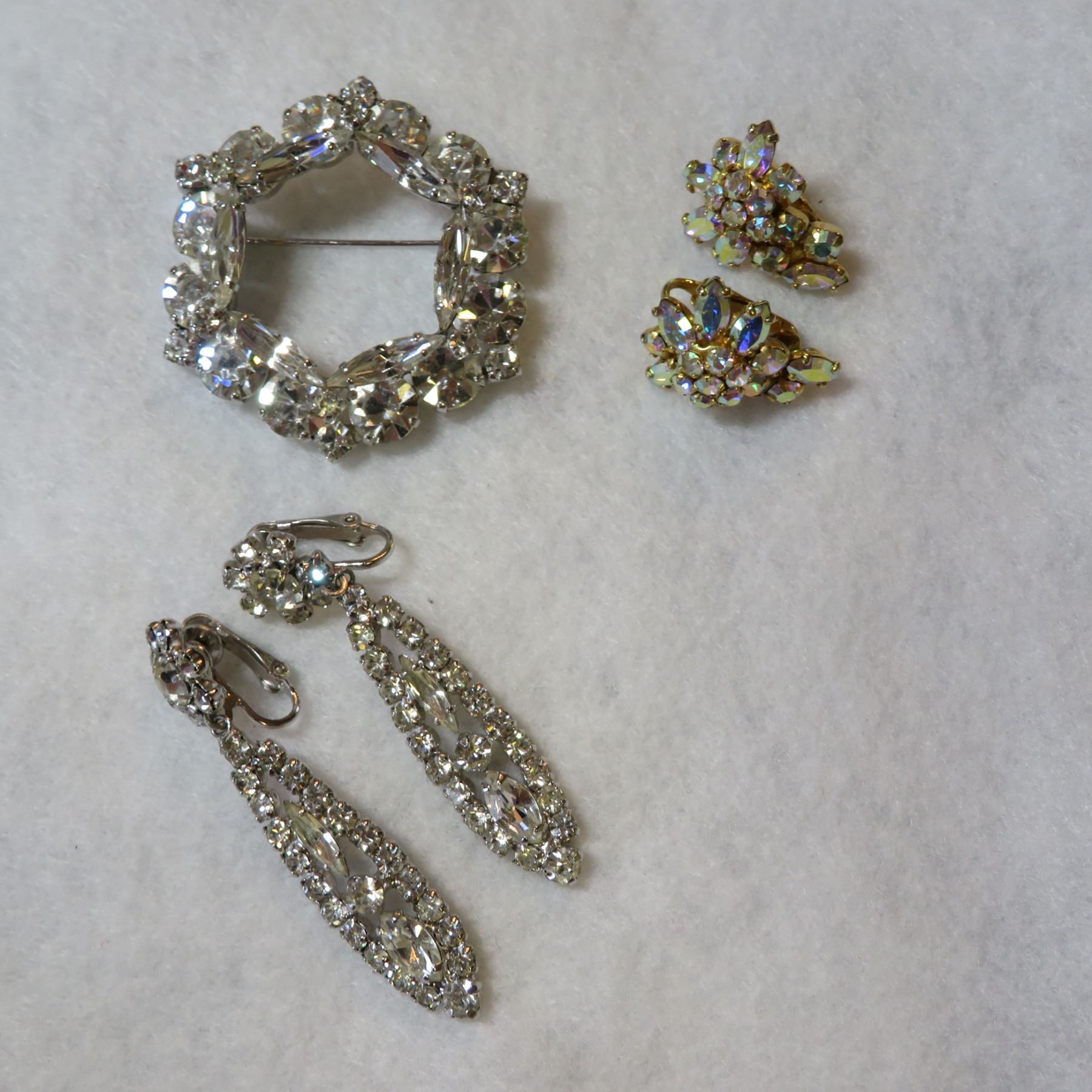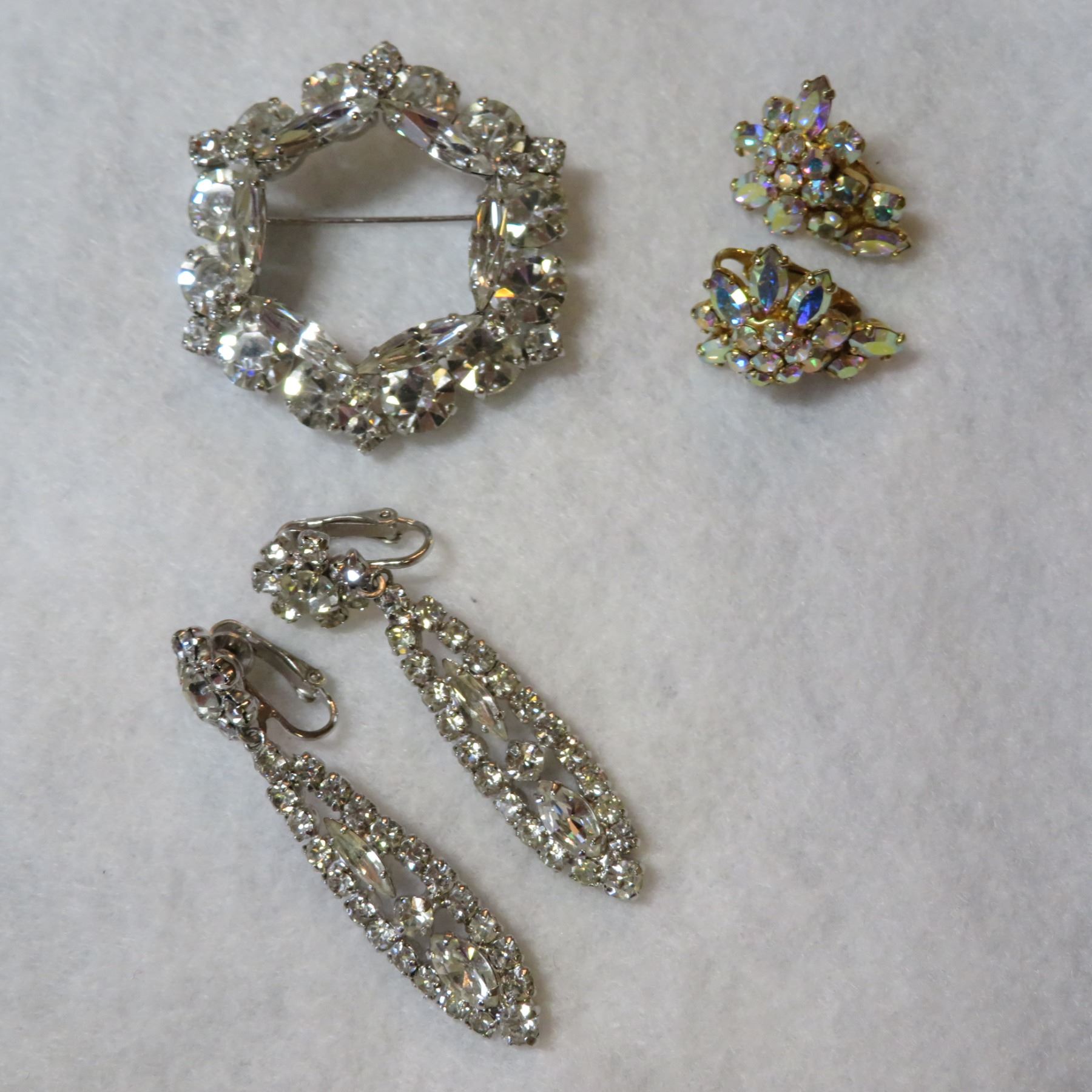SHERMAN lot. Wonderful Sherman brooch with two pairs of clip on earrings. One pair of clear stone drop down earrings (the drop down ones are less common). One pair of Aurora Borealis Iridescent earrings. These are all in great condition!