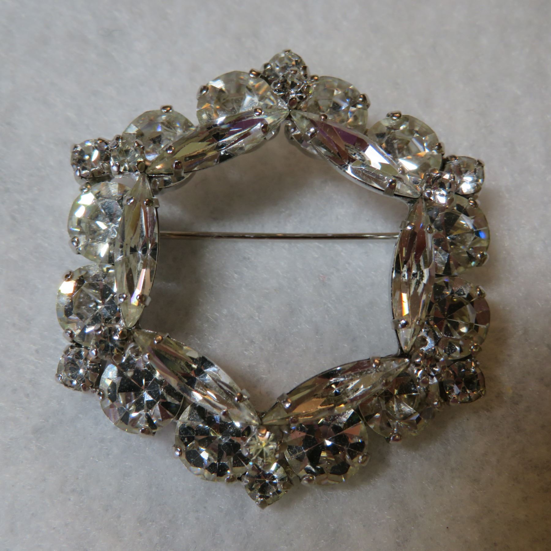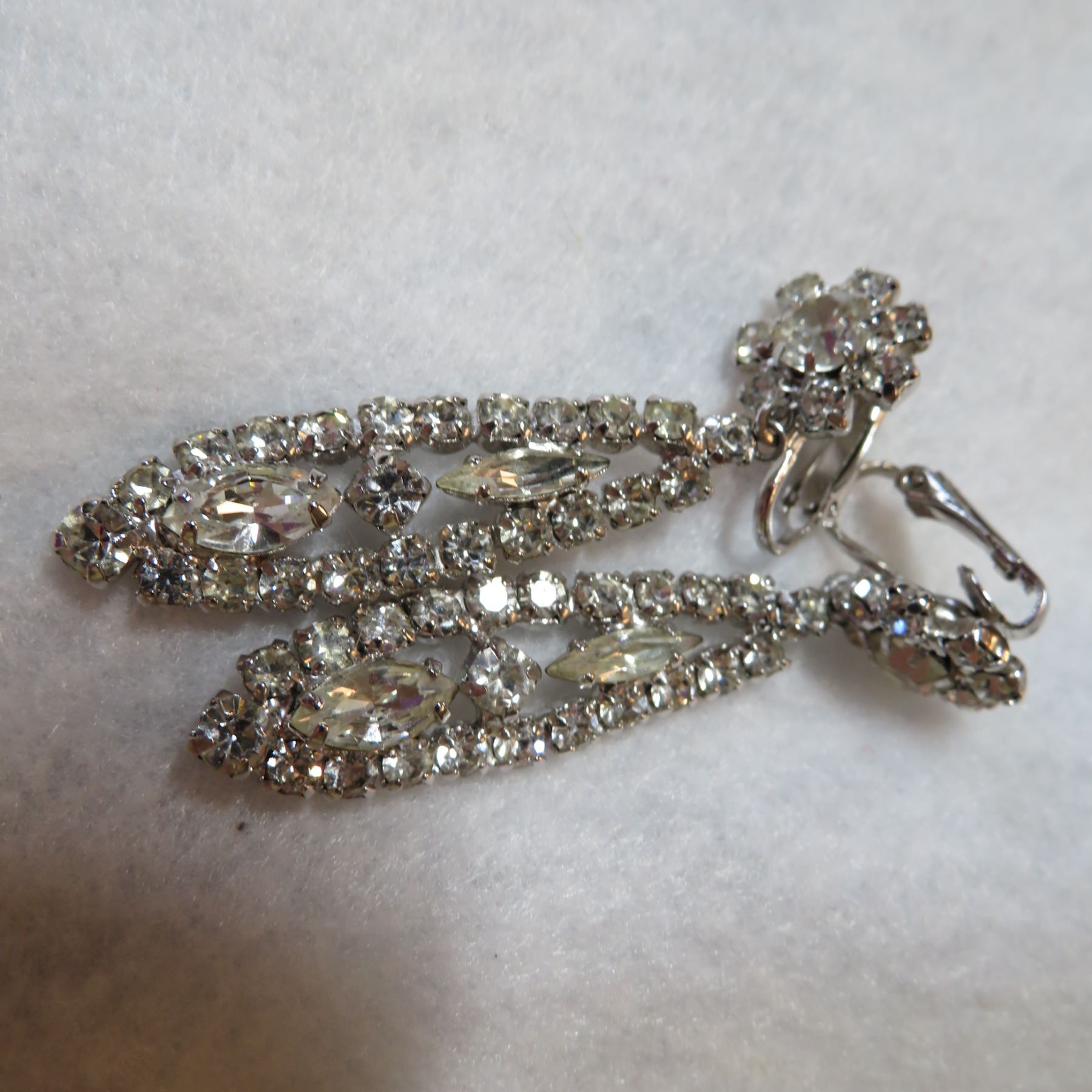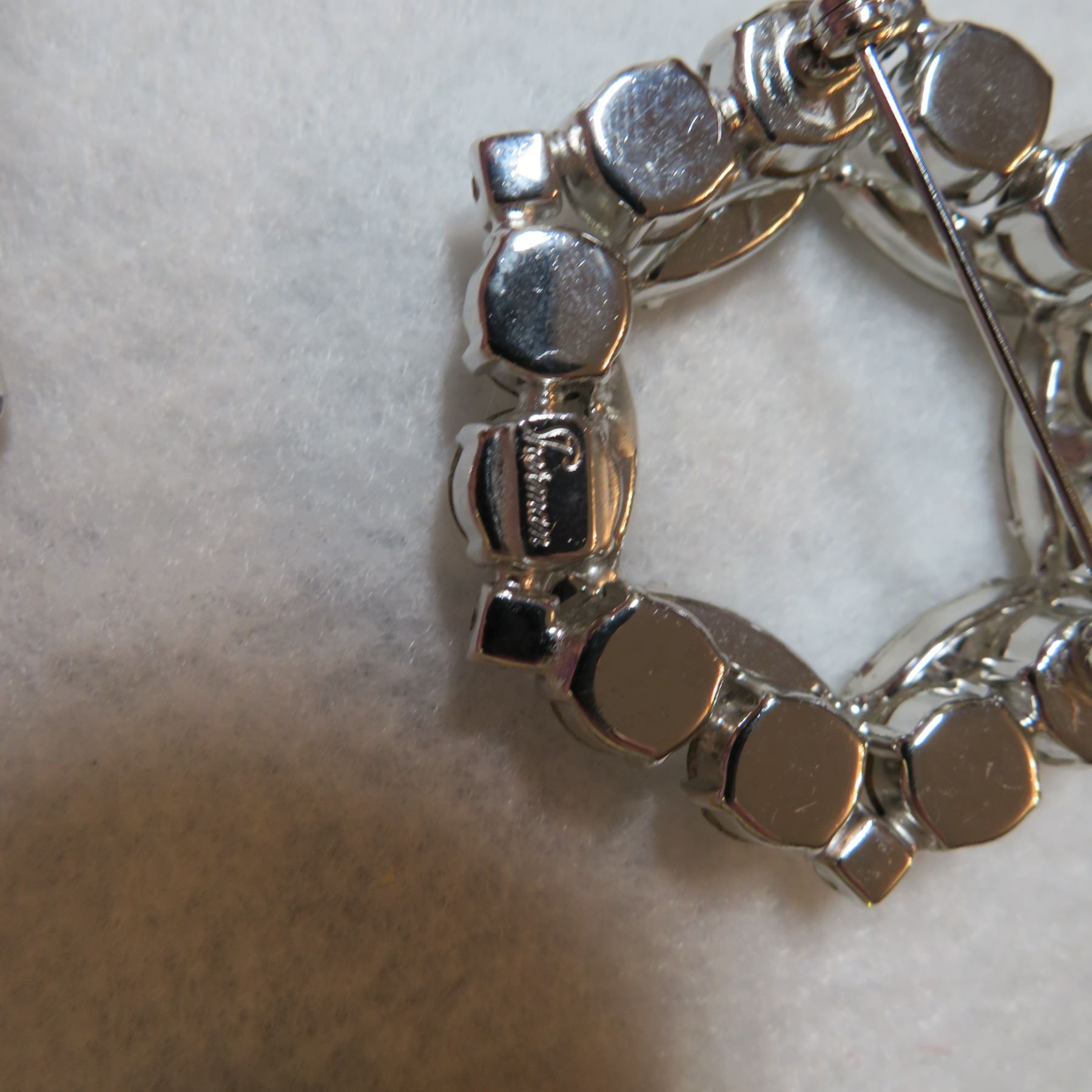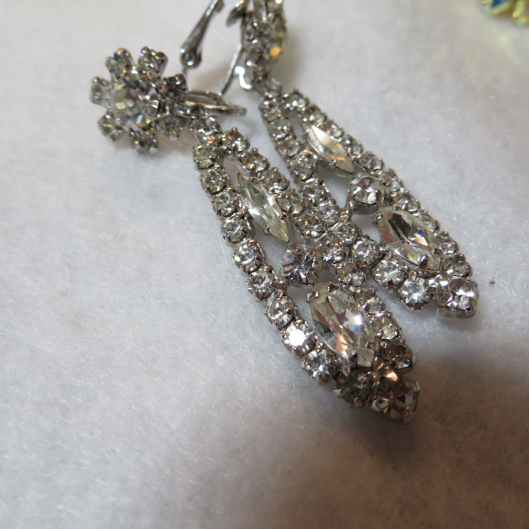 SHERMAN lot. Wonderful Sherman brooch with two pairs of clip on earrings. One pair of clear stone drop down earrings (the drop down ones are less common). One pair of Aurora Borealis Iridescent earrings. These are all in great condition!