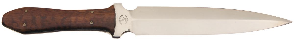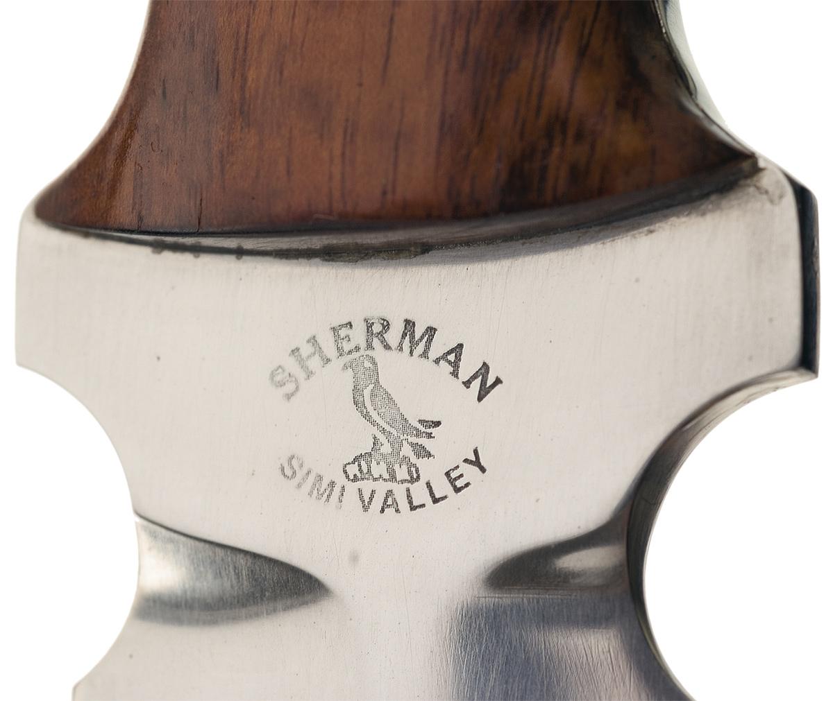 This dagger was handcrafted by a Californian knifemaker. The 7 inch long blade is marked "SHERMAN" over a bird over "SIMI VALLEY". The handle is fitted with nicely figured exotic hardwood panels secured with four rivets. OAL: 11 3/8".