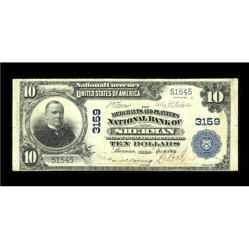 <B>Sherman, TX</B></I> - $10 1902 Plain Back Fr. 624 <B>The Merchants & Planters NB</B></I> Ch. # 3159<BR>This <B>Fine</B></I> note still displays evidence of the stamped officers' signatures.<BR><BR><b>Shipping:</b> Coin/Currency (<a target="_blank" href="http://www.heritageauctions.com/common/shipping.php">view shipping information</a>)