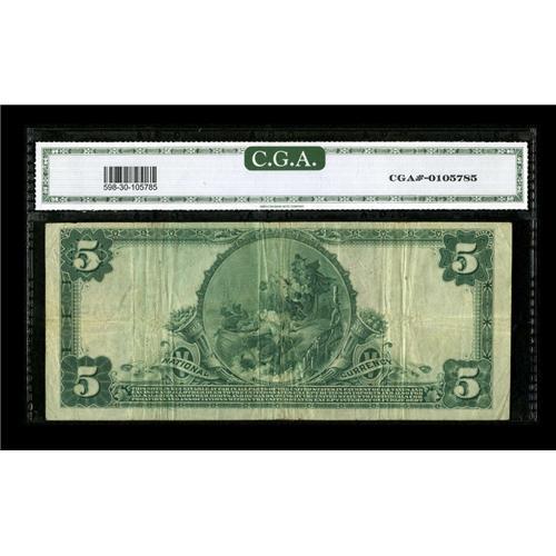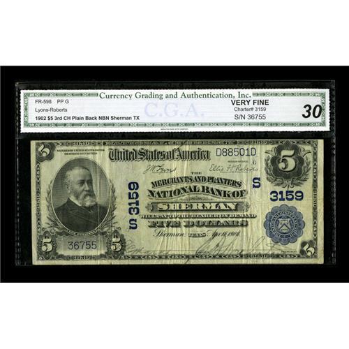 <B>Sherman, TX</B></I> - $5 1902 Plain Back Fr. 598 <B>The Merchants & Planters NB</B></I> Ch. # (S)3159<BR>This was the biggest bank between St. Louis and Galveston for many years due to railroad and Indian Territory accounts. This example is bright for the grade with natural surfaces. <B>CGA Very Fine 30.</B></I><BR><BR><b>Shipping:</b> Coins & Currency (<a target="_blank" href="http://www.heritageauctions.com/common/shipping.php">view shipping information</a>)
