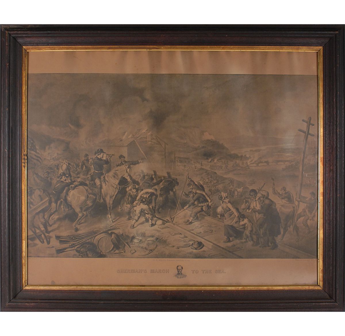 Original engraved print entitled ‘Sherman’s March to the Sea,’ 27.5 x 22, featuring a detailed and dramatic scene from Sherman’s most famous campaign. Published by H. H. Willes of Hartford, bearing an 1883 copyright notice to the lower right. Attractively presented in a period frame to an overall size of 32.75 x 27.25. Bands of toning to the upper portion, otherwise fine condition.