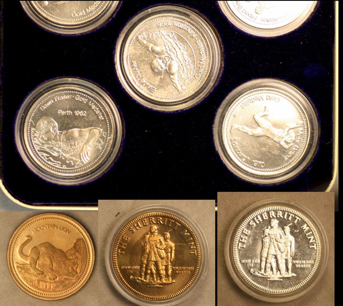 Sherrit Mint Medals, Includes Calgary Stampede Dollars 1971-1980. The Doug Stephens collection of 10-33mm medals in a presentation box (SM-9), 1978 XI Commonwealth Games Medals. Five medals in a presentation box with the games logo (SM-5), a 33mm mountain lion / Sherritt Mint design in aureate Bronze bonded steel in original presentation box (SM-6), 33mm mountain lion / Sherritt Mint design in .999 silver proof. In presentation box. (SM-7), 1534-1984 – 450 Year Anniversary “ Jacques Cartier Au Quebec”. 35mm aureate bronze bonded steel. Proof. In presentation case (SM-8),