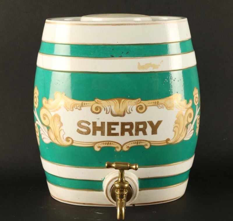 English Mid 19th Century. White ceramic with green stripe with"Sherry" and floral motif in gilt. 9"l x 5"w x 10 3/4"h. Comes with lid and brass spigot. Crack on left side otherwise good.