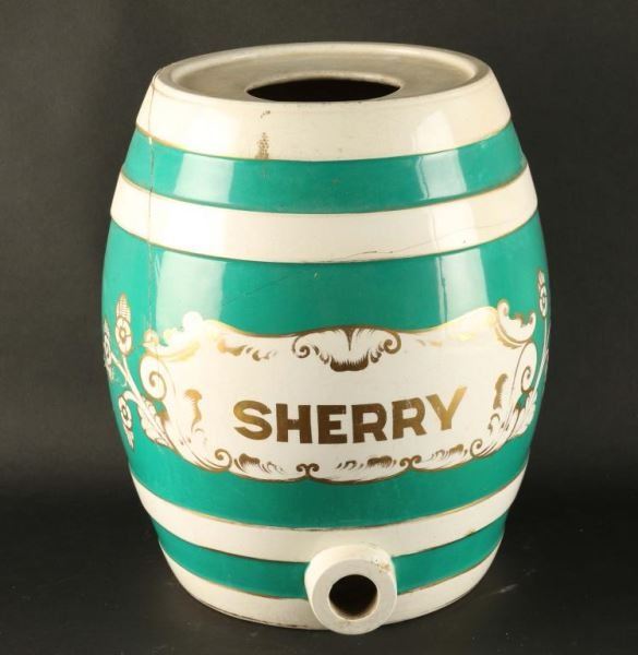 English Mid 19th Century. White ceramic with gilt trimmed teal stripes. "Sherry" and floral motif in gilt. Repair on left side with crack on the right. small chip on top of spigot hole. Measures 13"h x 8"dia.