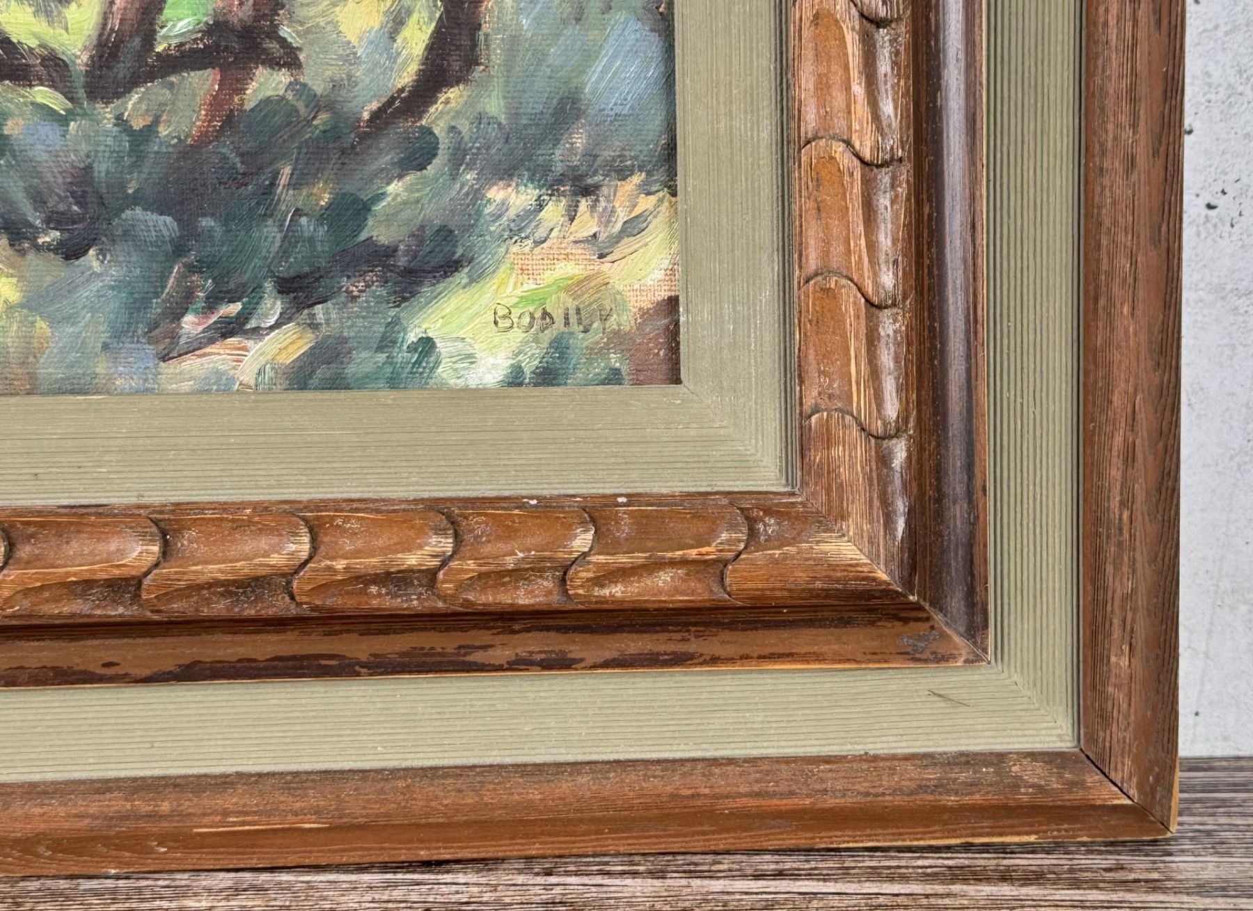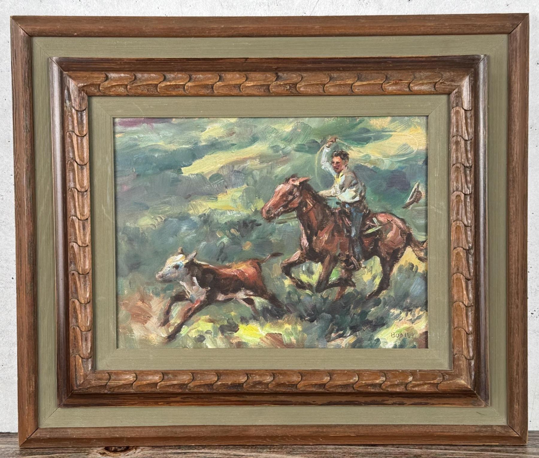 Title is Roping the Calf. 9" by 12" unframed. 16" by 19" framed. Oil on Canvas. Sheryl L. Bodily (Born 1936) is active/lives in Montana, Idaho. Sheryl Bodily is known for Western frontier scene painting, wildlife, horses. A western wildlife and landscape artist, Sheryl Bodily is a resident of Montana. He was the winner of the 1986 Ellensburg Washington Rodeo Association Poster Award, and recently received Best of Show/Flatwork at the Florence Festival Art Auction in Florence, Montana. Favorite subjects rendered in oil and pencil include Indian scenes with children, old cabins, wagon trains and wildlife. He is widely exhibited in Sante Fe and Taos, New Mexico, Sedona, Arizona and Idaho. In the fall of 1970, an art auction was held through the Pacific Northwest Indian Center in Spokane, Washington. To that auction a young man named Sheryl Bodily, from Columbia Falls, Montana, brought a few of his oil paintings. A good deal of excitement was caused by the fact that Mr. Bodily's paintings were sold at auction for twice their listed value. A few months later the performance was repeated at another art auction in Great Falls, Montana, and suddenly an artist who had been painting professionally for 12 years, two of them full time, was discovered. Suddenly a man who had had to work hard to sell his work, found himself with more advance commissions than he could readily complete. Western artist Sheryl Bodily was born in Boise, Idaho, on April 20, 1936, the second oldest in a family with one brother and four sisters. Mr. Bodily's father was a farmer in the Boise Valley, and he remembers six moves to different farms in that region. He described his father as the breadwinner and his mother as the counselor and teacher in his early years. "I remember milking eight to fifteen cows which was always my chore at home, but my real interest at that time was the hobby of collecting arrowheads and other artifacts in Rocky Canyon with my younger brother near Meridian, Idaho." His enthusiastic interest in Indian people and their contemporary culture has continued to grow over the years and has had a tremendous influence on his art. Mr. Bodily first remembers drawing in the first grade of the Meridian Idaho Grade School, and being told at that time by his teacher that someday he would become an artist. The artist laughingly suggested that, "it took nearly thirty years to prove her right." Mr. Bodily began oil painting at 14, and oil has been his primary medium since that time. He has also completed a number of works in pen and ink, but at present works almost entirely in oils. "I would like to do more pen and inks, but I´m so busy now with oils that I really can't find the time." After completing high school, Mr. Bodily studied commercial art for two years at Brigham Young University in Utah. He found during those two years that commercial art held little interest for him as a lifetime pursuit and at the end of two years he accepted a call to serve a two and one half year mission for his church to the Spanish speaking peoples of Texas and New Mexico. During this period, and shortly afterward, he traveled extensively in the southwest and expanded his interest in contemporary and historical Indian culture to include those of the southwest. Those years influenced his art and this influence can occasionally be noted in the rich colors used in the countryside depicted in some of his works.