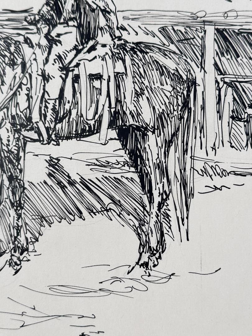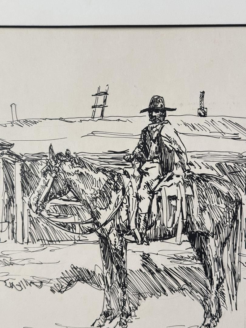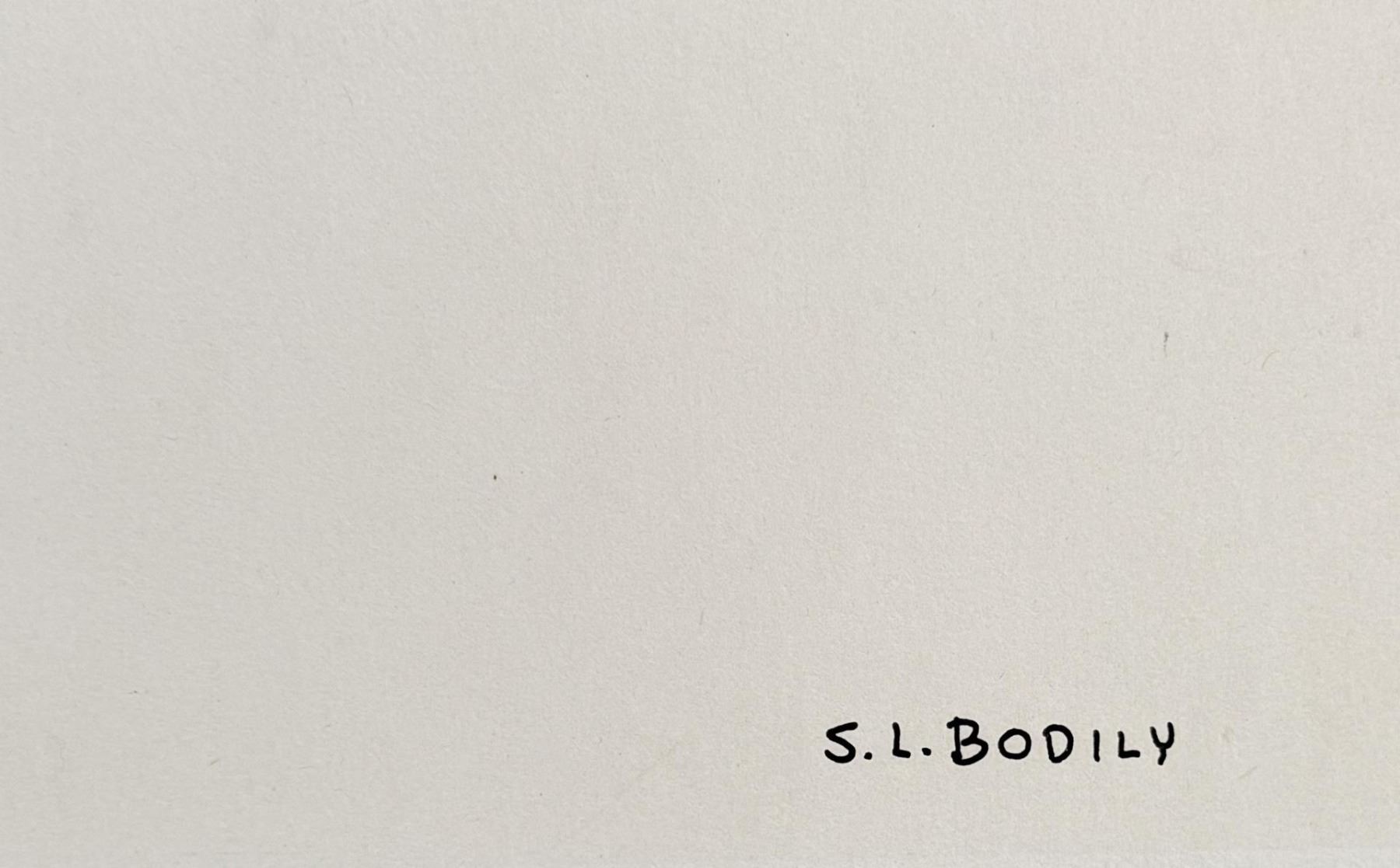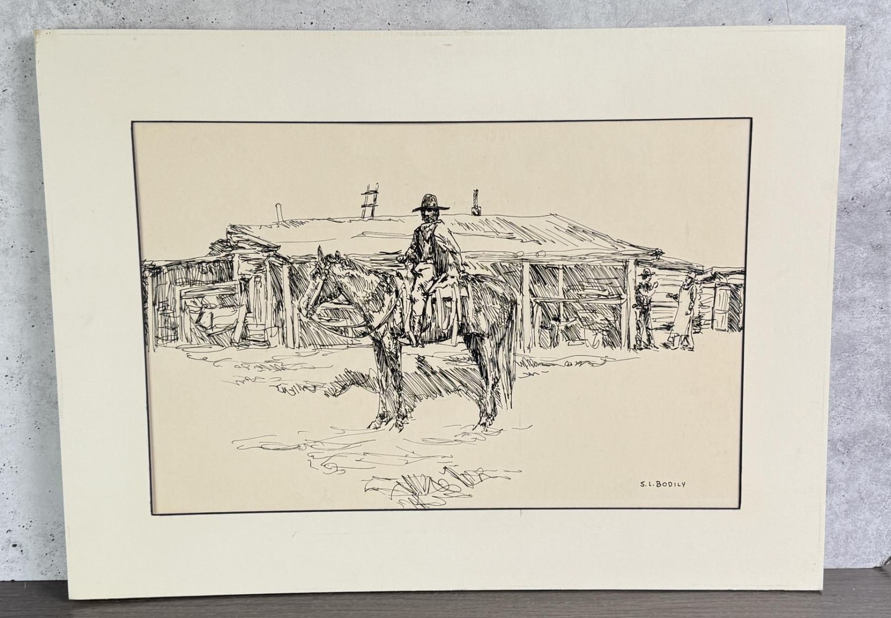 Title is Frontier Town. 16 1/2" by 22 1/2" in matte. Sheryl L. Bodily (Born 1936) is active/lives in Montana, Idaho. Sheryl Bodily is known for Western frontier scene painting, wildlife, horses. A western wildlife and landscape artist, Sheryl Bodily is a resident of Montana. He was the winner of the 1986 Ellensburg Washington Rodeo Association Poster Award, and recently received Best of Show/Flatwork at the Florence Festival Art Auction in Florence, Montana. Favorite subjects rendered in oil and pencil include Indian scenes with children, old cabins, wagon trains and wildlife. He is widely exhibited in Santa Fe and Taos, New Mexico, Sedona, Arizona and Idaho. In the fall of 1970, an art auction was held through the Pacific Northwest Indian Center in Spokane, Washington. To that auction a young man named Sheryl Bodily, from Columbia Falls, Montana, brought a few of his oil paintings. A good deal of excitement was caused by the fact that Mr. Bodily's paintings were sold at auction for twice their listed value. A few months later the performance was repeated at another art auction in Great Falls, Montana, and suddenly an artist who had been painting professionally for 12 years, two of them full time, was discovered. Suddenly a man who had had to work hard to sell his work, found himself with more advance commissions than he could readily complete. Western artist Sheryl Bodily was born in Boise, Idaho, on April 20, 1936, the second oldest in a family with one brother and four sisters. Mr. Bodily's father was a farmer in the Boise Valley, and he remembers six moves to different farms in that region. He described his father as the breadwinner and his mother as the counselor and teacher in his early years. "I remember milking eight to fifteen cows which was always my chore at home, but my real interest at that time was the hobby of collecting arrowheads and other artifacts in Rocky Canyon with my younger brother near Meridian, Idaho." His enthusiastic interest in Indian people and their contemporary culture has continued to grow over the years and has had a tremendous influence on his art. Mr. Bodily first remembers drawing in the first grade of the Meridian Idaho Grade School, and being told at that time by his teacher that someday he would become an artist. The artist laughingly suggested that, "it took nearly thirty years to prove her right." Mr. Bodily began oil painting at 14, and oil has been his primary medium since that time. He has also completed a number of works in pen and ink, but at present works almost entirely in oils. "I would like to do more pen and inks, but I´m so busy now with oils that I really can't find the time." After completing high school, Mr. Bodily studied commercial art for two years at Brigham Young University in Utah. He found during those two years that commercial art held little interest for him as a lifetime pursuit and at the end of two years he accepted a call to serve a two and one half year mission for his church to the Spanish speaking peoples of Texas and New Mexico. During this period, and shortly afterward, he traveled extensively in the southwest and expanded his interest in contemporary and historical Indian culture to include those of the southwest. Those years influenced his art and this influence can occasionally be noted in the rich colors used in the countryside depicted in some of his works.