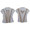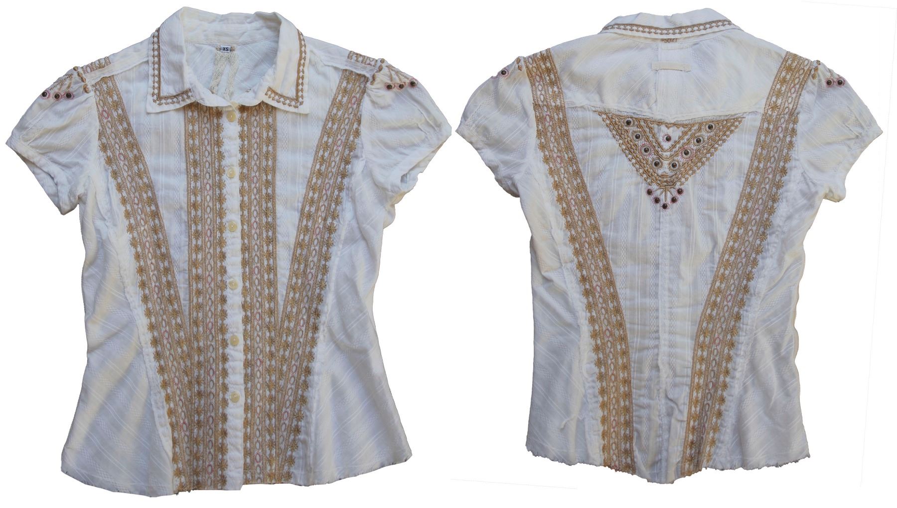 Embroidered shirt owned and worn by superstar Sheryl Crow. Button down white shirt is embroidered in brown and hints of pink with riveting to the shoulders and back. Cotton shirt is size XS. Near fine condition. With a COA from Sheryl Crow, originally sold to benefit Stand Up to Cancer.