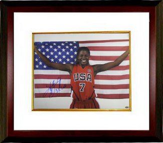 Sheryl Swoopes was the first player to be signed in the WNBA when it was created. She has won three Olympic Gold Medals and is a three-time WNBA MVP. Frequently referred to as the "female Michael Jordan," Swoopes is famous for both her offensive and defensive skills. In 2005, she averaged 18.6 points, 85% free throws, 4.3 assists, 2.65 steals and 37.1 minutes playing time per game. In 2011, she was voted in by fans as one of the Top 15 players in WNBA history. Sheryl Swoopes has hand signed this Team USA Olympics 16x20 Photo with US Flag with 3X Gold inscription. Leaf Authentics Hologram and Certificate of Authenticity from Athlon Sports. Custom White Mat and Premium Mahogany Frame as shown.