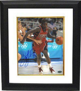 Sheryl Swoopes was the first player to be signed in the WNBA when it was created. She has won three Olympic Gold Medals and is a three-time WNBA MVP. Frequently referred to as the "female Michael Jordan," Swoopes is famous for both her offensive and defensive skills. In 2005, she averaged 18.6 points, 85% free throws, 4.3 assists, 2.65 steals and 37.1 minutes playing time per game. In 2011, she was voted in by fans as one of the Top 15 players in WNBA history. Sheryl Swoopes has hand signed this Team USA Olympics 8x10 Photo. Leaf Authentics Hologram and Certificate of Authenticity from Athlon Sports. Custom White Mat and Premium Black Frame as shown.