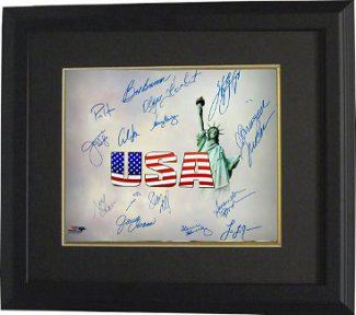 The modern Olympic Games are the leading international sporting event featuring summer and winter sports competitions wherein thousands of athletes variously compete. The Olympic Games are considered the world's foremost sports competition with more than 200 nations participating. The Olympic Games are held every four years, with the Summer and Winter Games alternating by occurring every four years but two years apart. Their creation was inspired by the ancient Olympic Games, which were held in Olympia, Greece, from the 8th century BC to the 4th century AD. This 16x20 photo has been hand signed by 15 Olympians: Olga Korbut, Nancy Kerrigan, Mark Spitz, Kerri Strug, Bob Beamon, Jaycie Phelps, Paul Hamm, Carl Lewis, Amanda Borden, Dominique Moceanu, Amy Chow, Lolo Jones, Janet Evans, Shannon Miller and Sheryl Swoopes. MAB Hologram and Certificate of Authenticity from Athlon Sports. Custom Black Mat and Premium Black Frame as shown.
