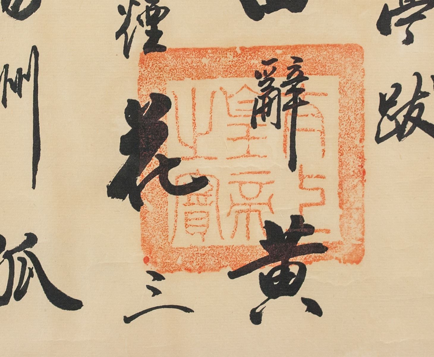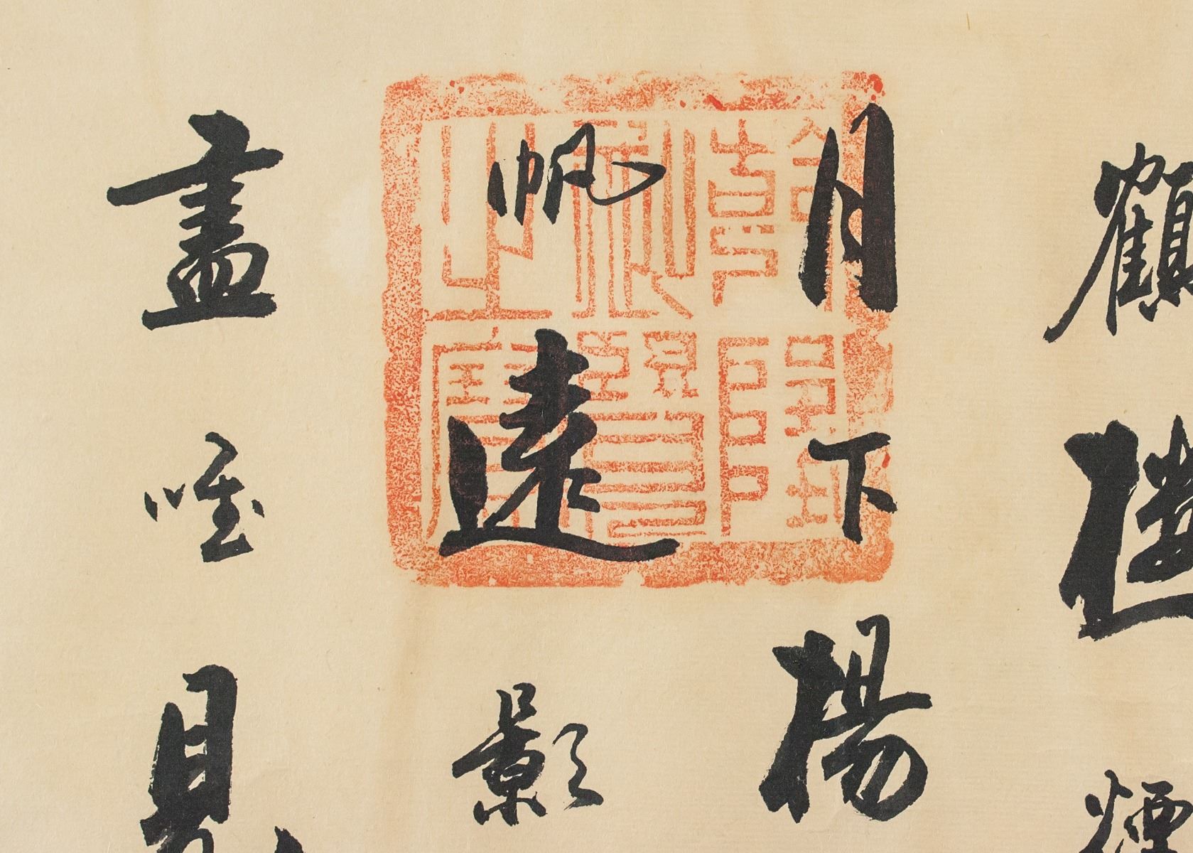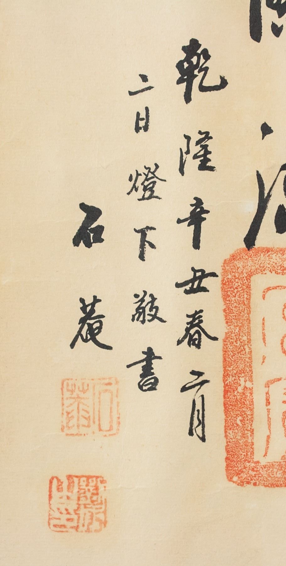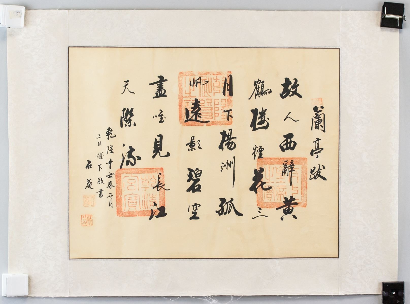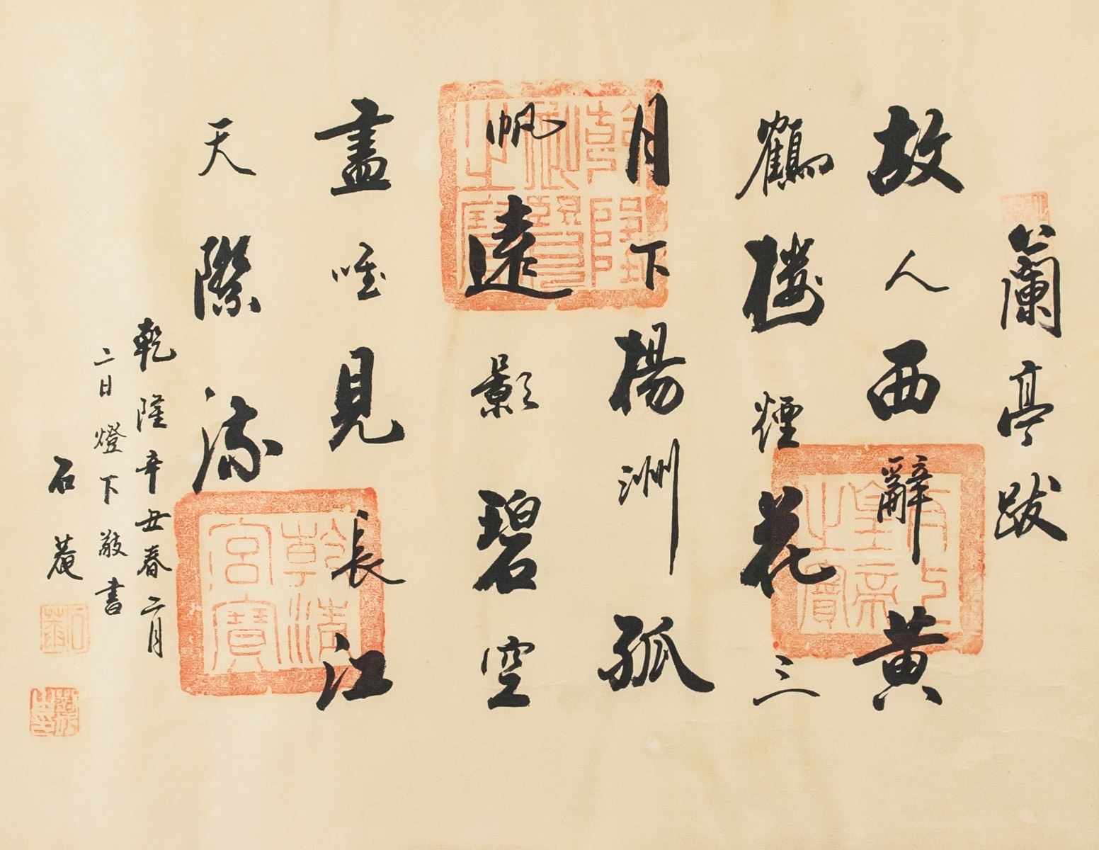 Chinese ink on paper. Featuring calligraphy with stamps. Signed "Shi An" in Chinese characters to the left. Inscribed with two artist seals and four collector seals, including a seal reading "Qianlong". 47 x 65 cm.