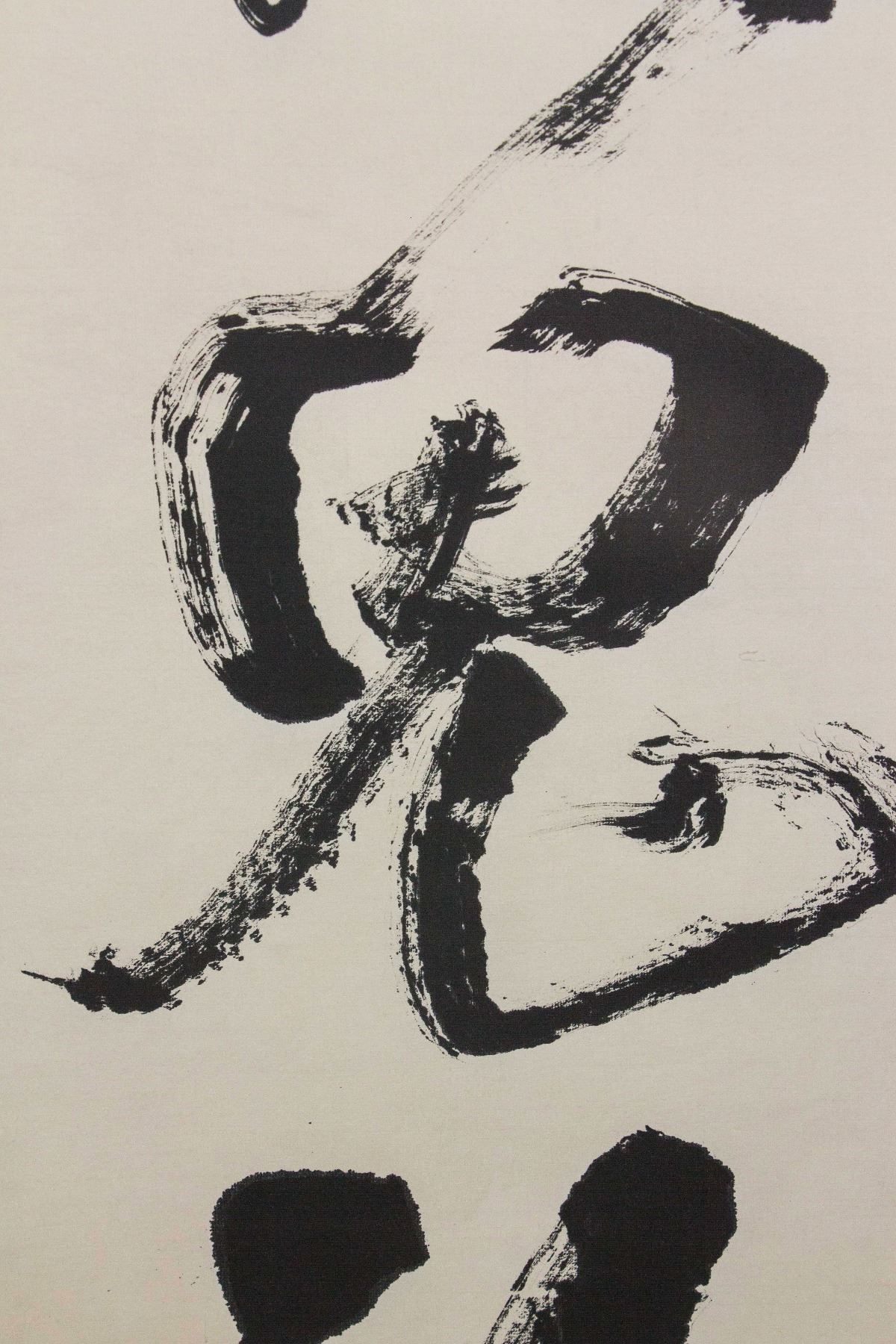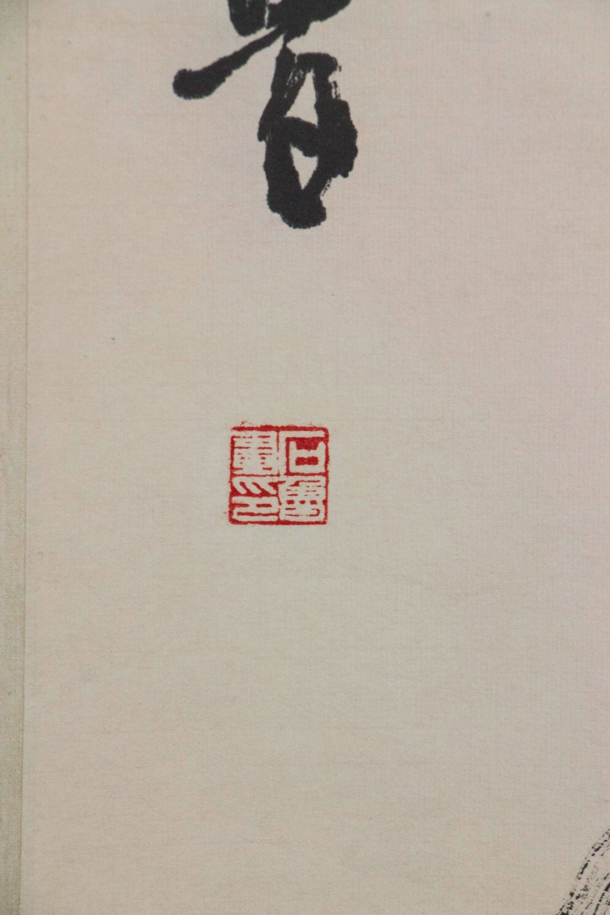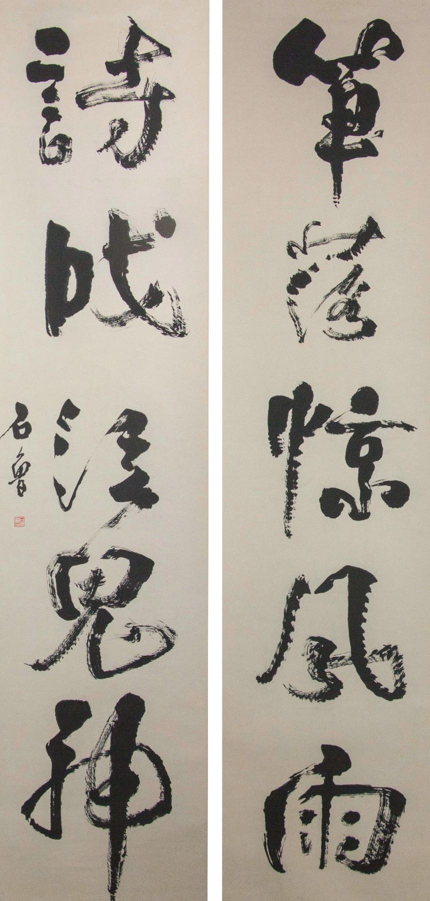 Chinese calligraphy "Bi Luo Jing Feng Yu, Shi Cheng Qi Gui Shen"; Chinese ink on paper; hanging scrolls; signed Shi Lu (1919-1982); inscribed with 1 artist seal; 179cm x 42cm
