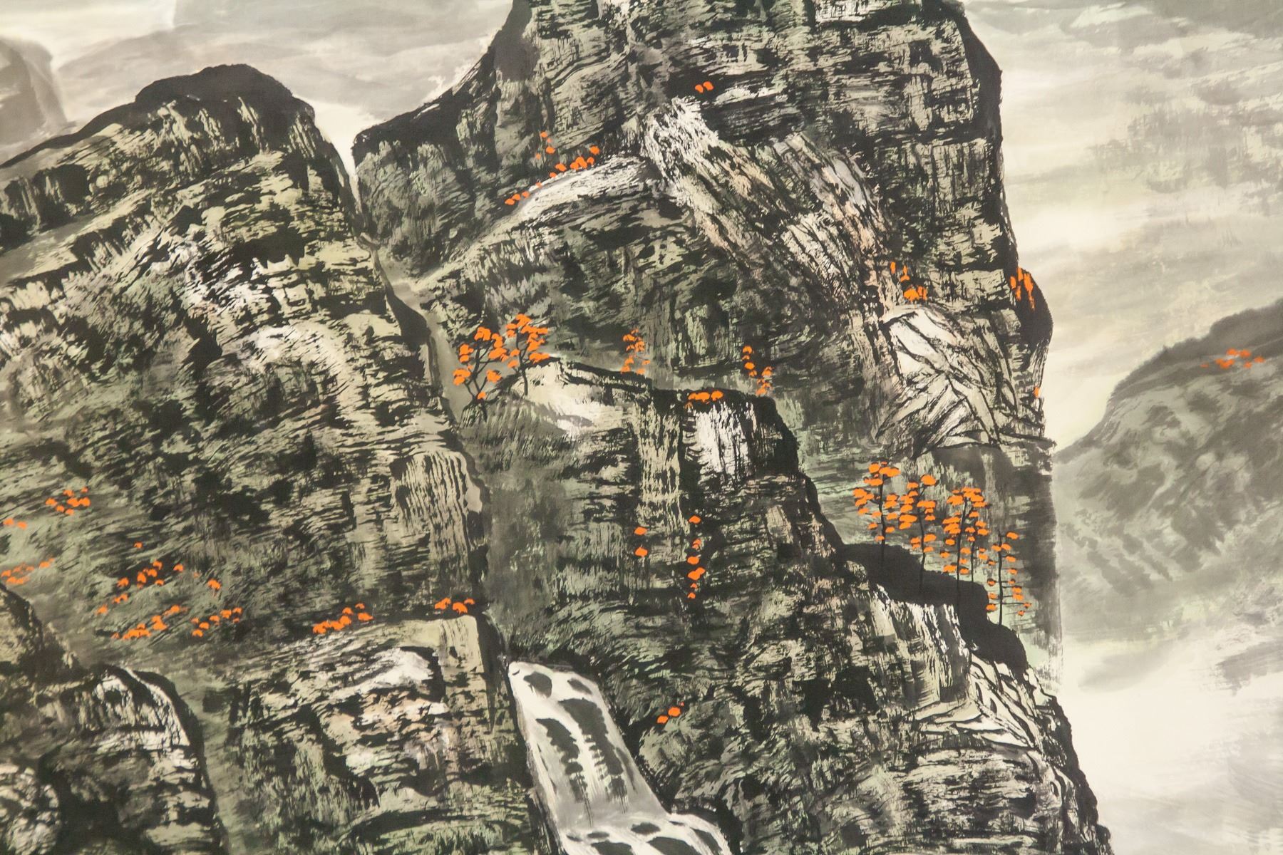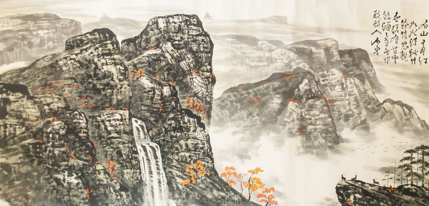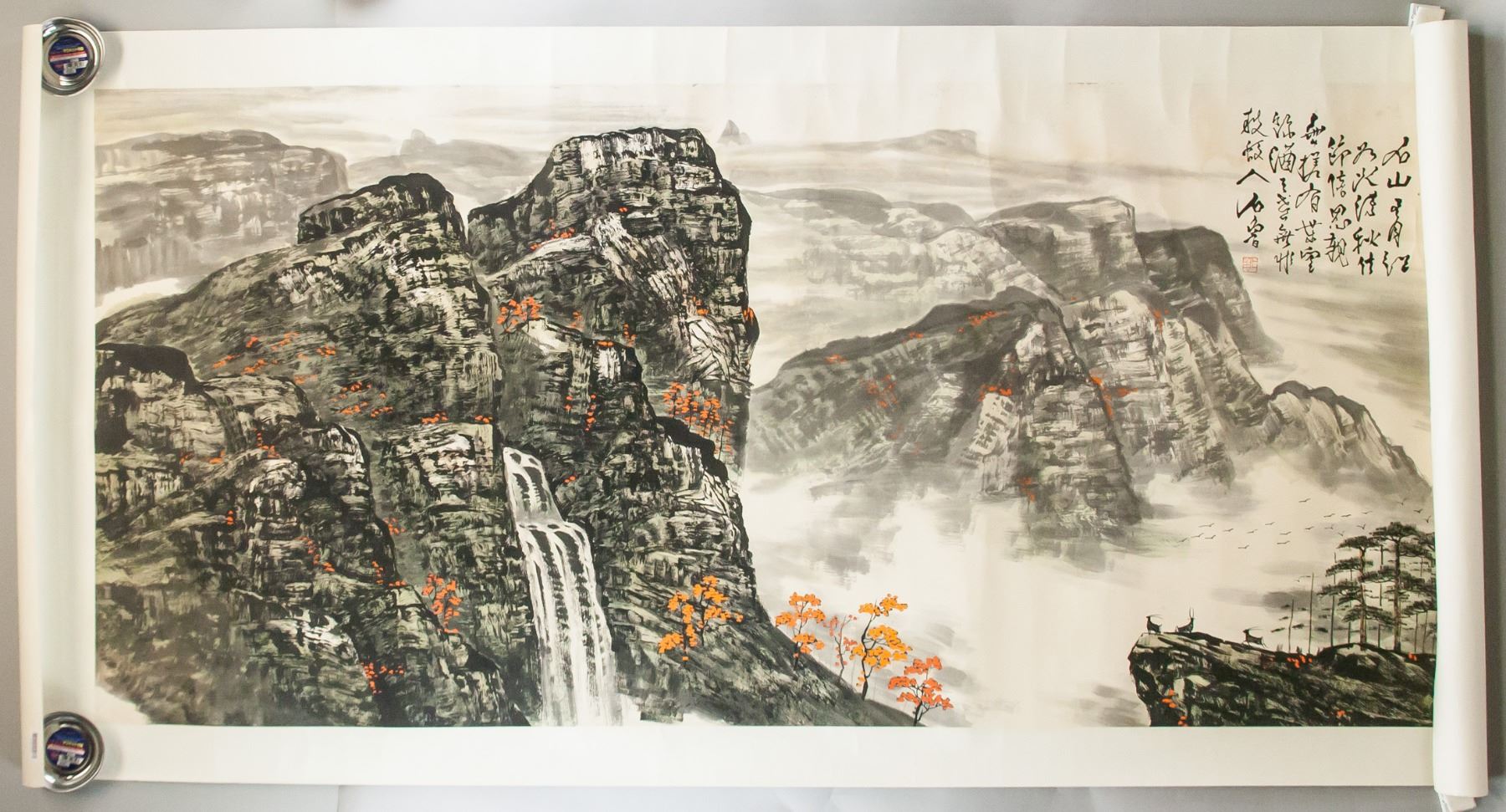Ink and watercolor on paper roll. Featuring mountainous landscape. Signed Shi Lu (1919-1982, Chinese), inscribed with 1 artist seal. 84 x 175 cm