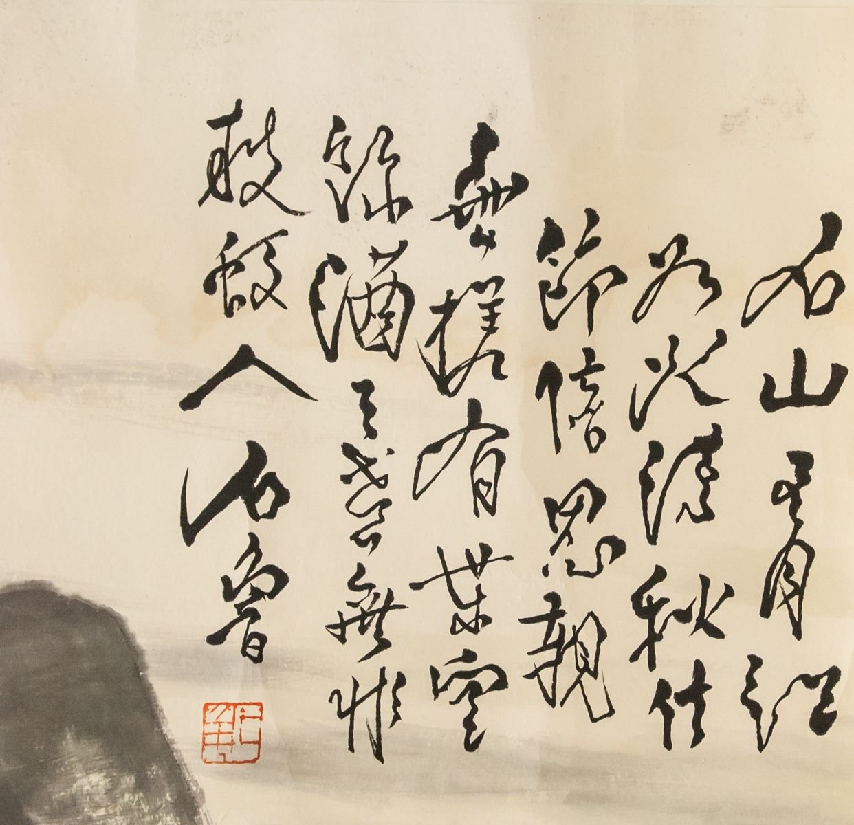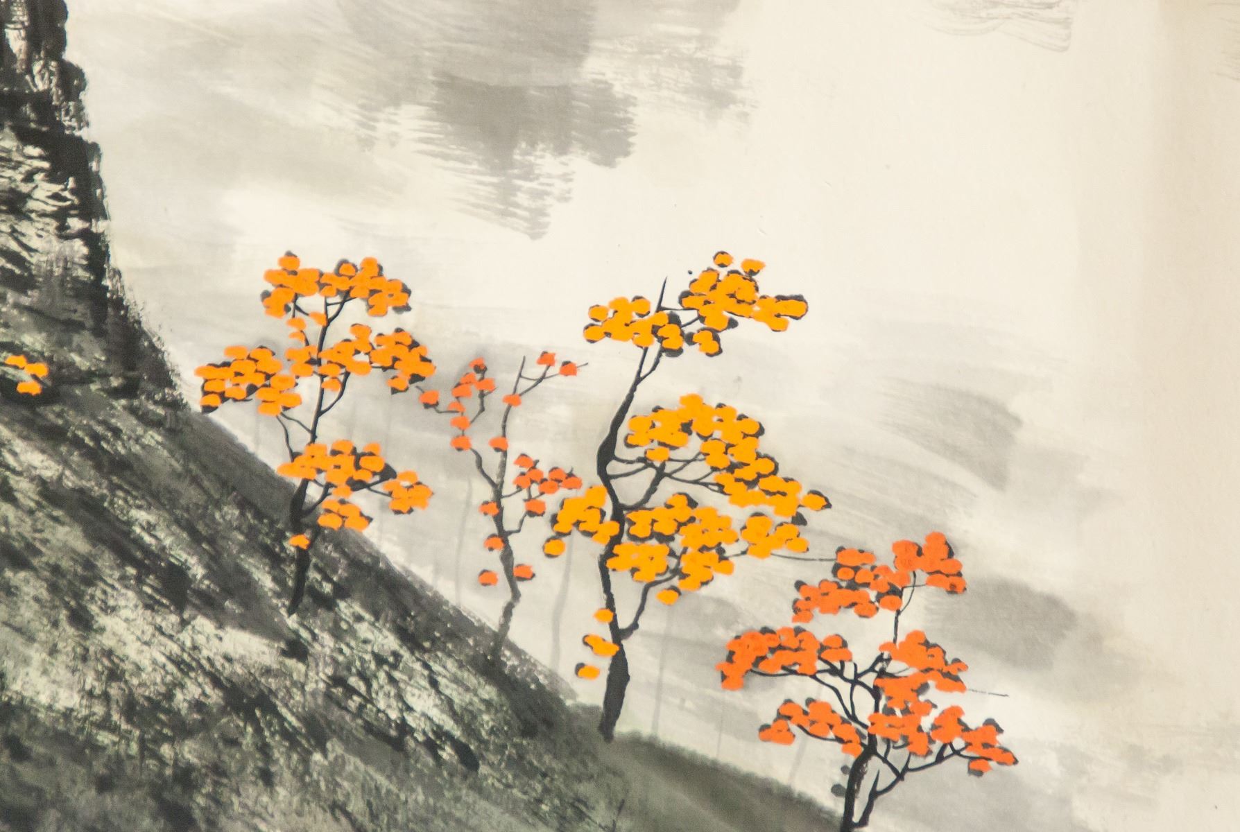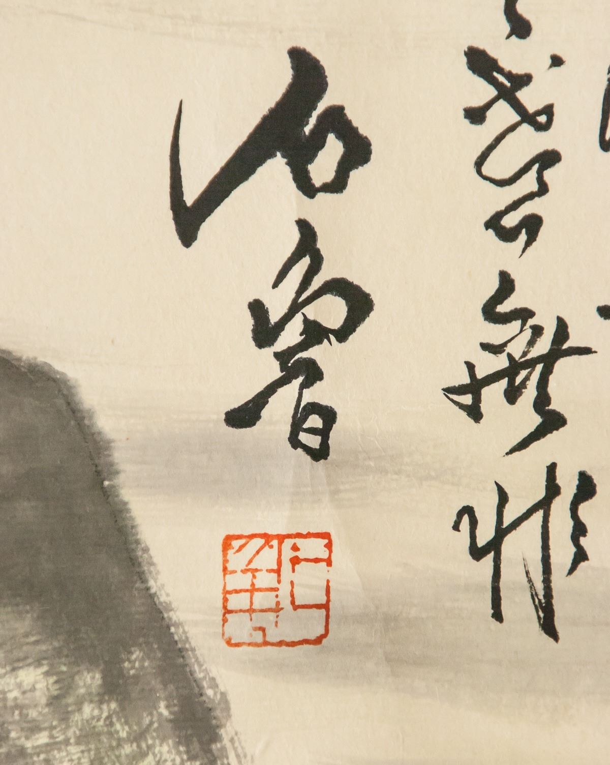 Ink and watercolor on paper roll. Featuring mountainous landscape. Signed Shi Lu (1919-1982, Chinese), inscribed with 1 artist seal. 84 x 175 cm