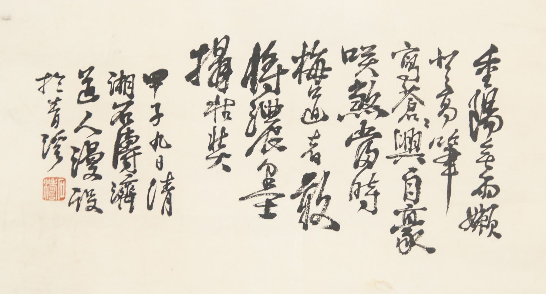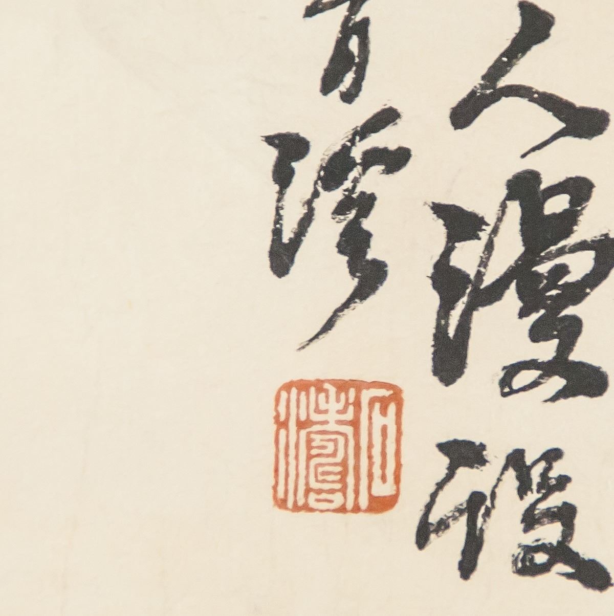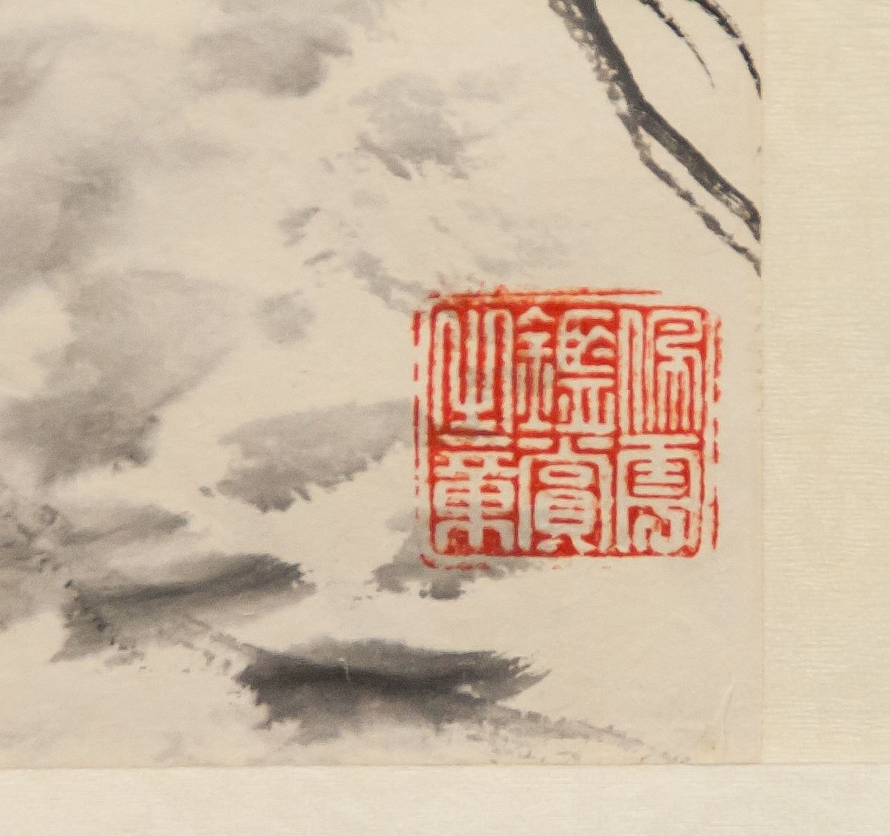 Ink on scroll. Featuring house among the mountains. Stamped in the bottom right corner. Signed "Shi Tao". Featuring one artist stamp. Attributed to Shi Tao (1642-1707, Chinese). 99 x 42 cm