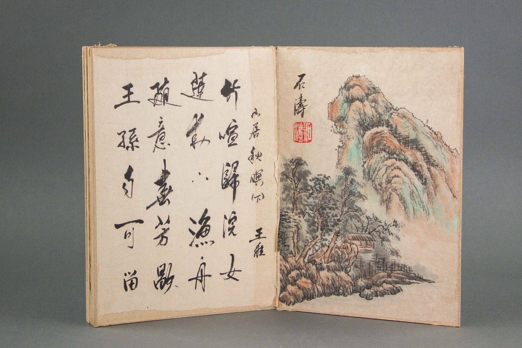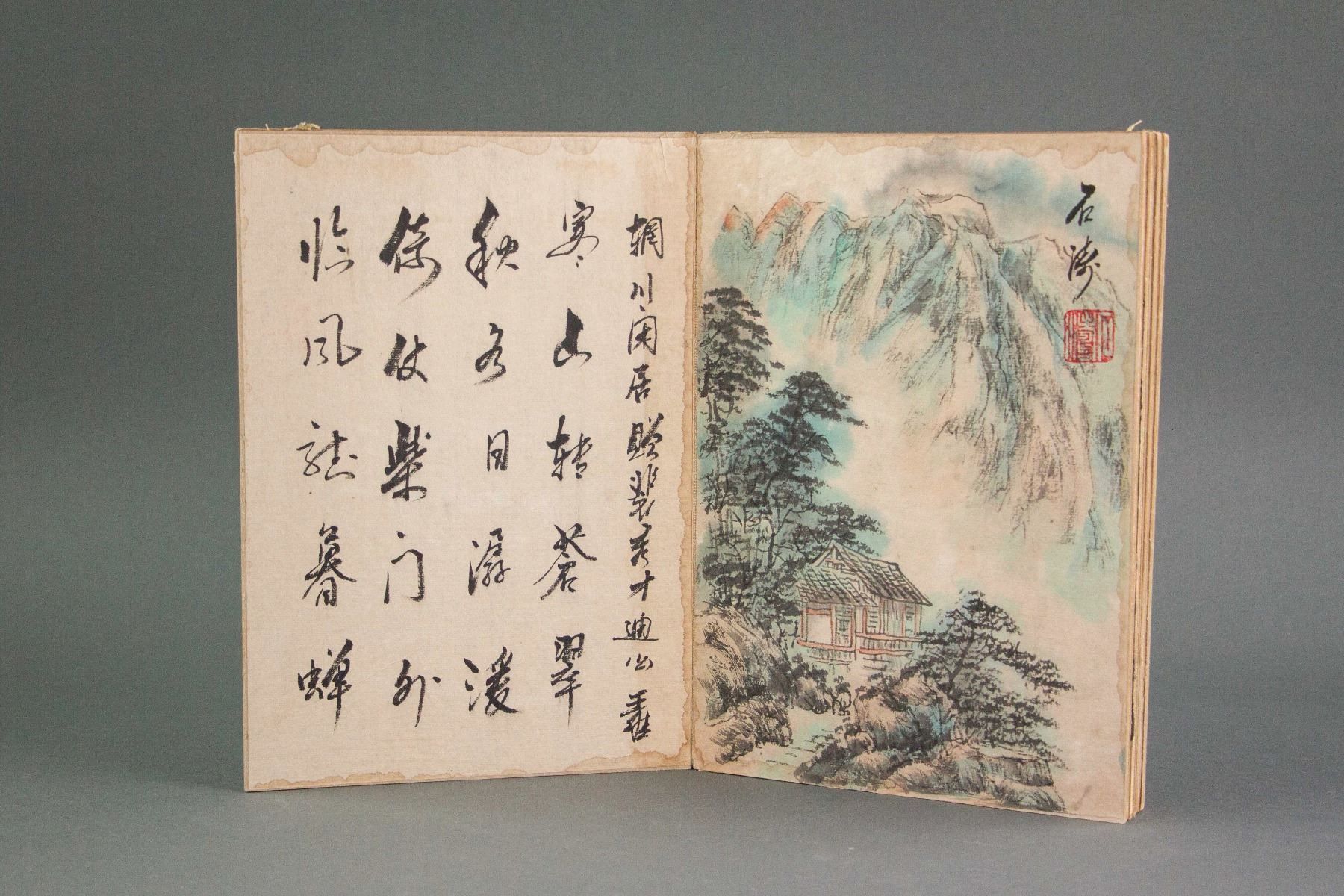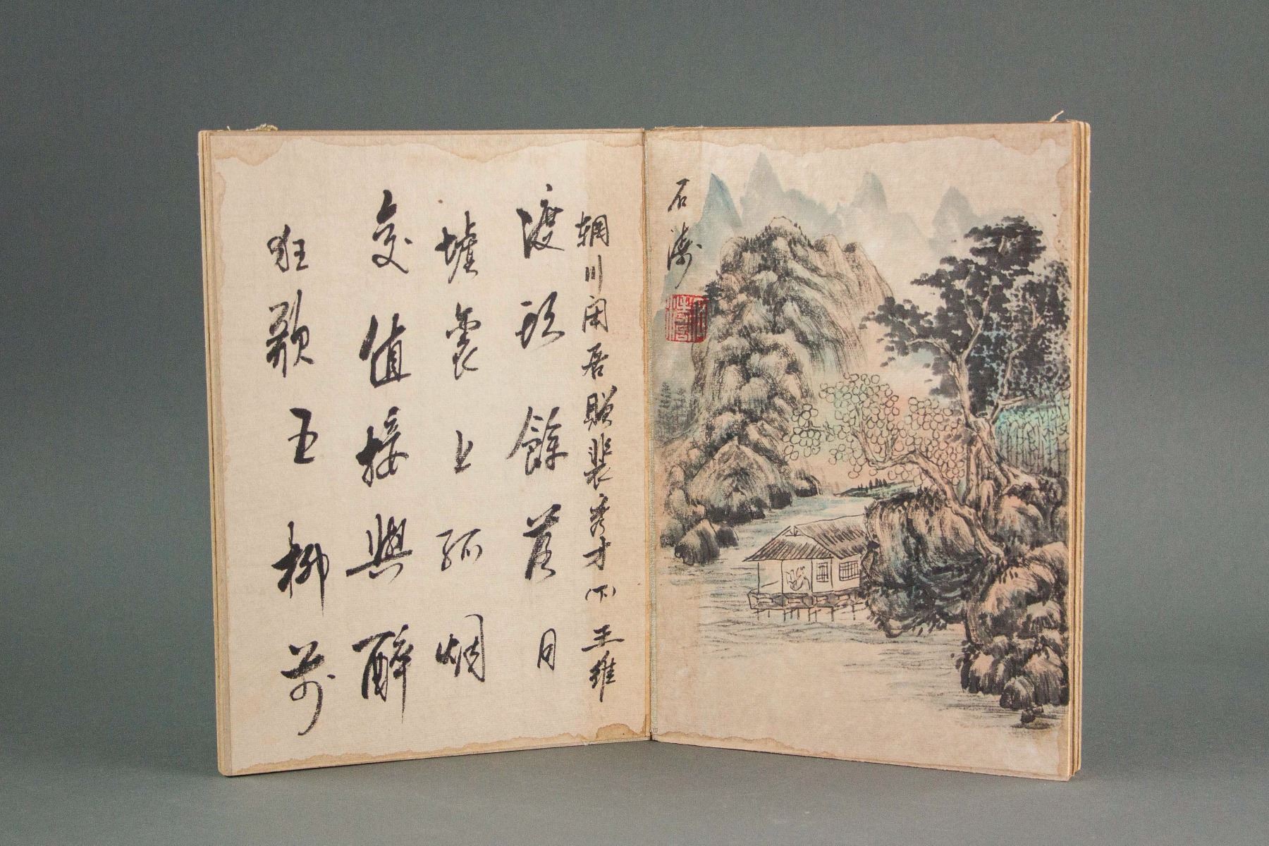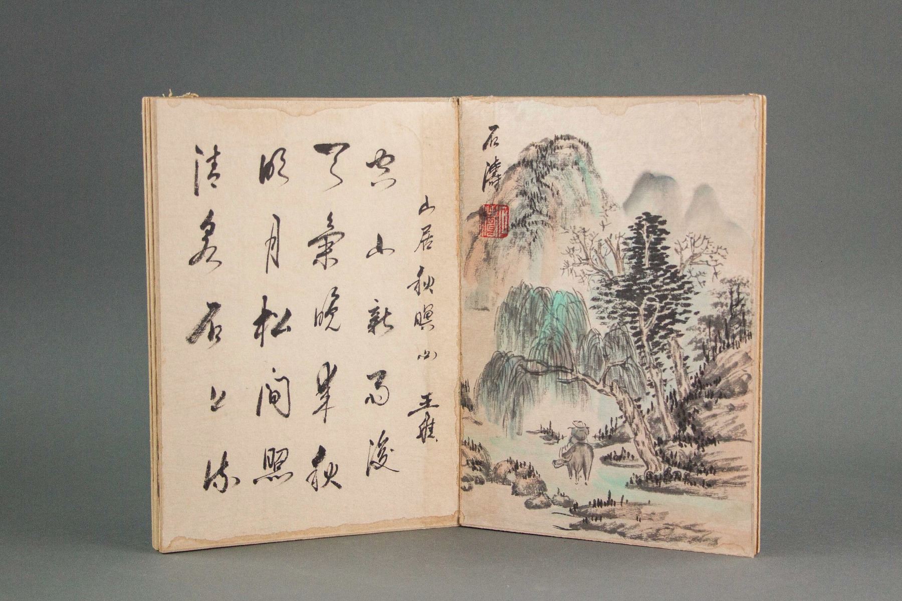 Mountainous landscape with Chinese calligraphy; Chinese ink and watercolour on paper booklet; signed Shi Tao (1642-1707); inscribed with 4 artist seals; 27 cm x 152 cm