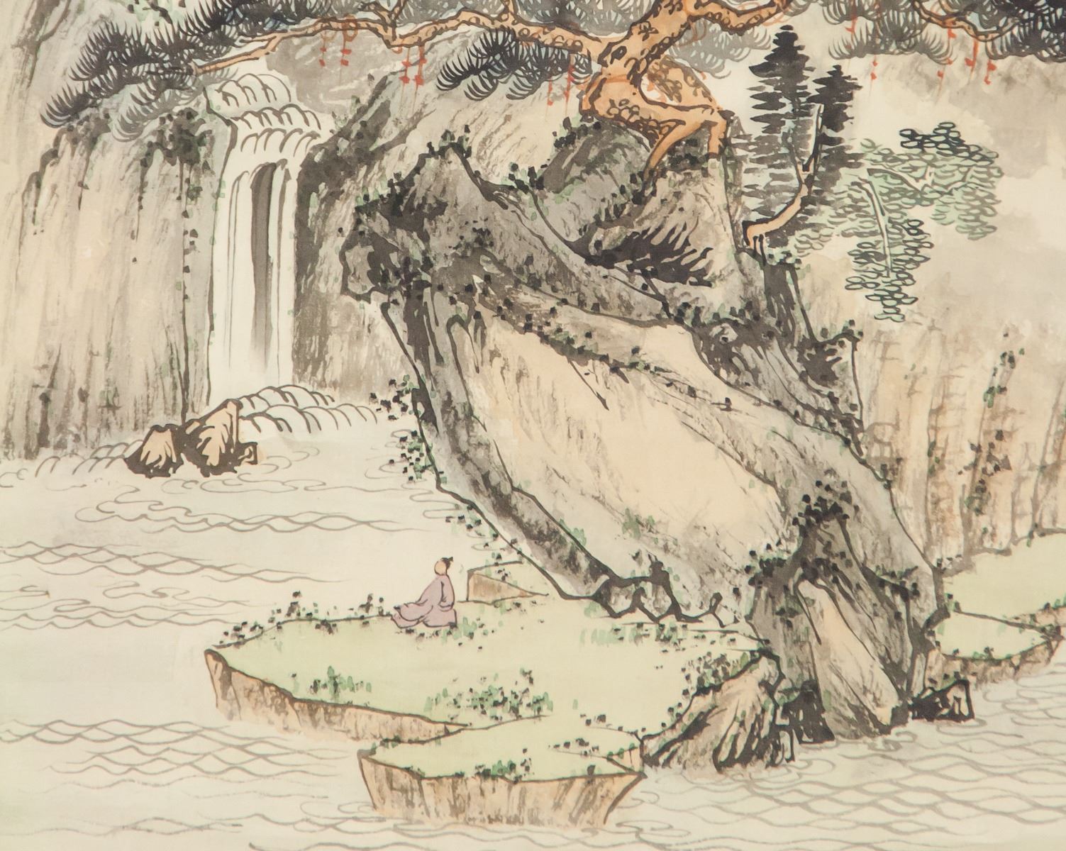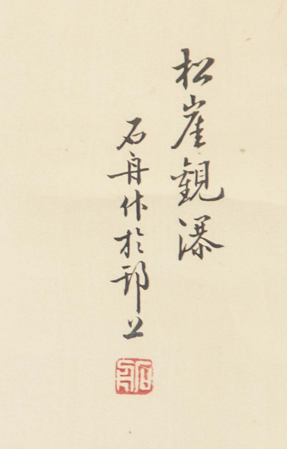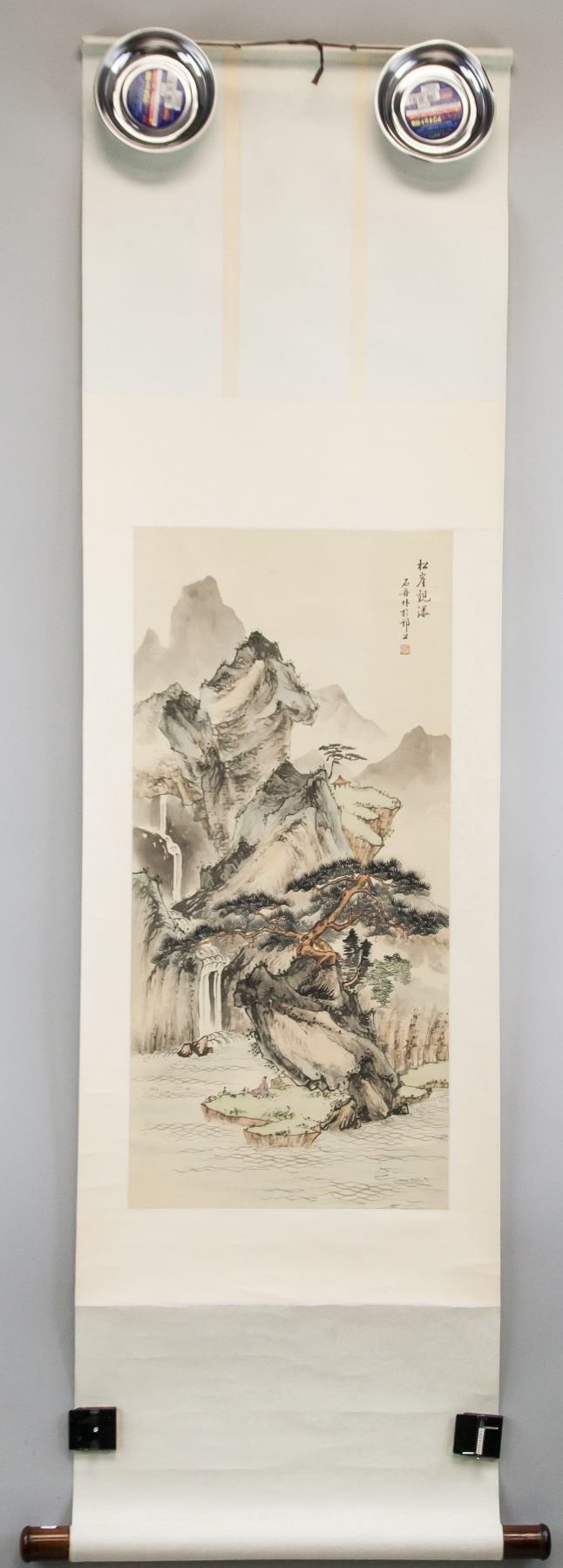 Ink and waterclor on paper, hanging scroll. Featuring mountainous landscape. Signed Shi Zhou, inscribed with 1 artist seal. 60 x 28 cm